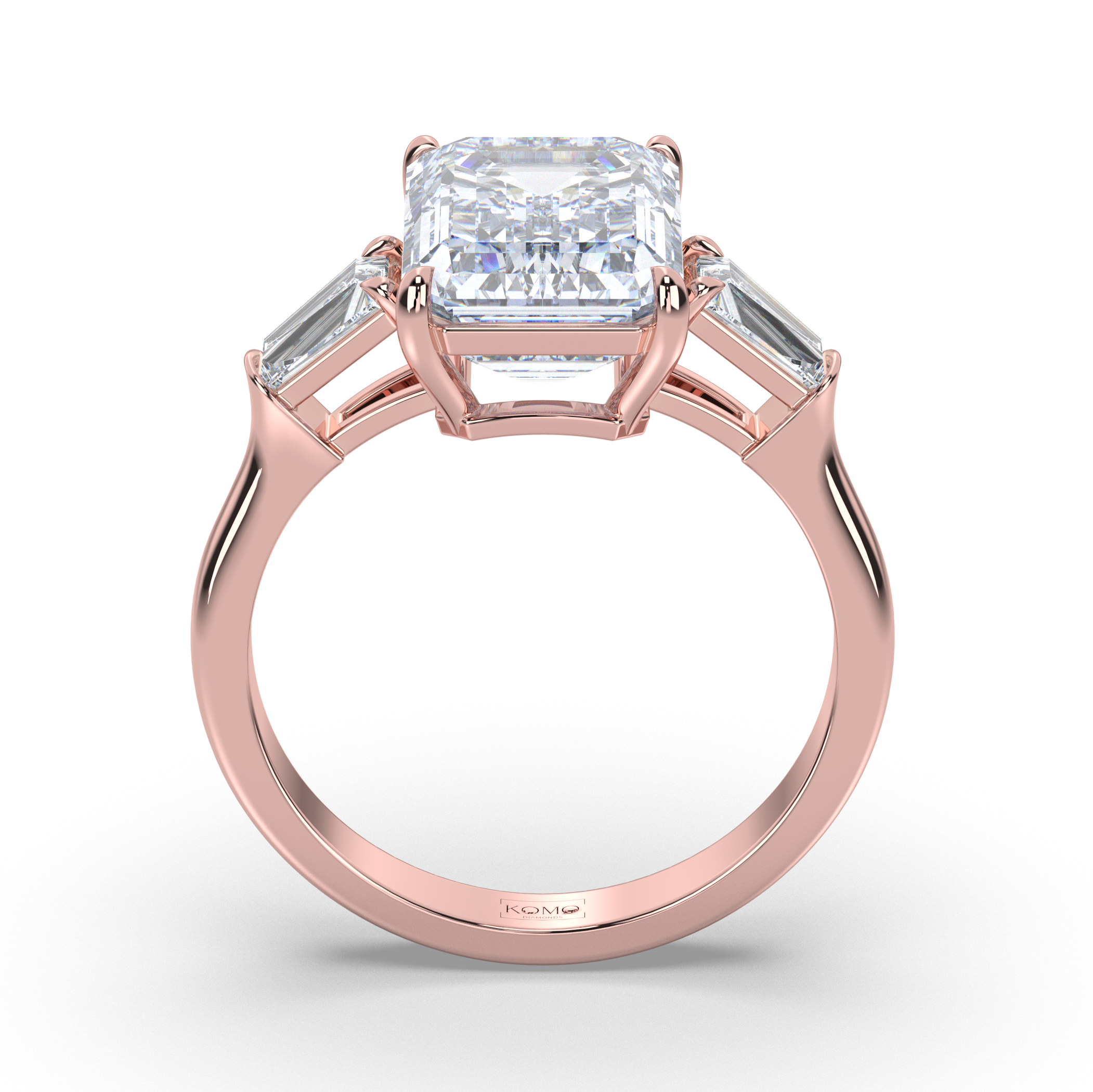 Complementing the majestic center stone are two exquisite tapered baguette lab-grown diamonds totaling 0.40 carats, each showcasing pristine E color and VS1 clarity. These side stones create perfect geometric harmony, their clean lines and precise angles enhancing the emerald-cut's architectural beauty while adding exceptional fire to the overall design.