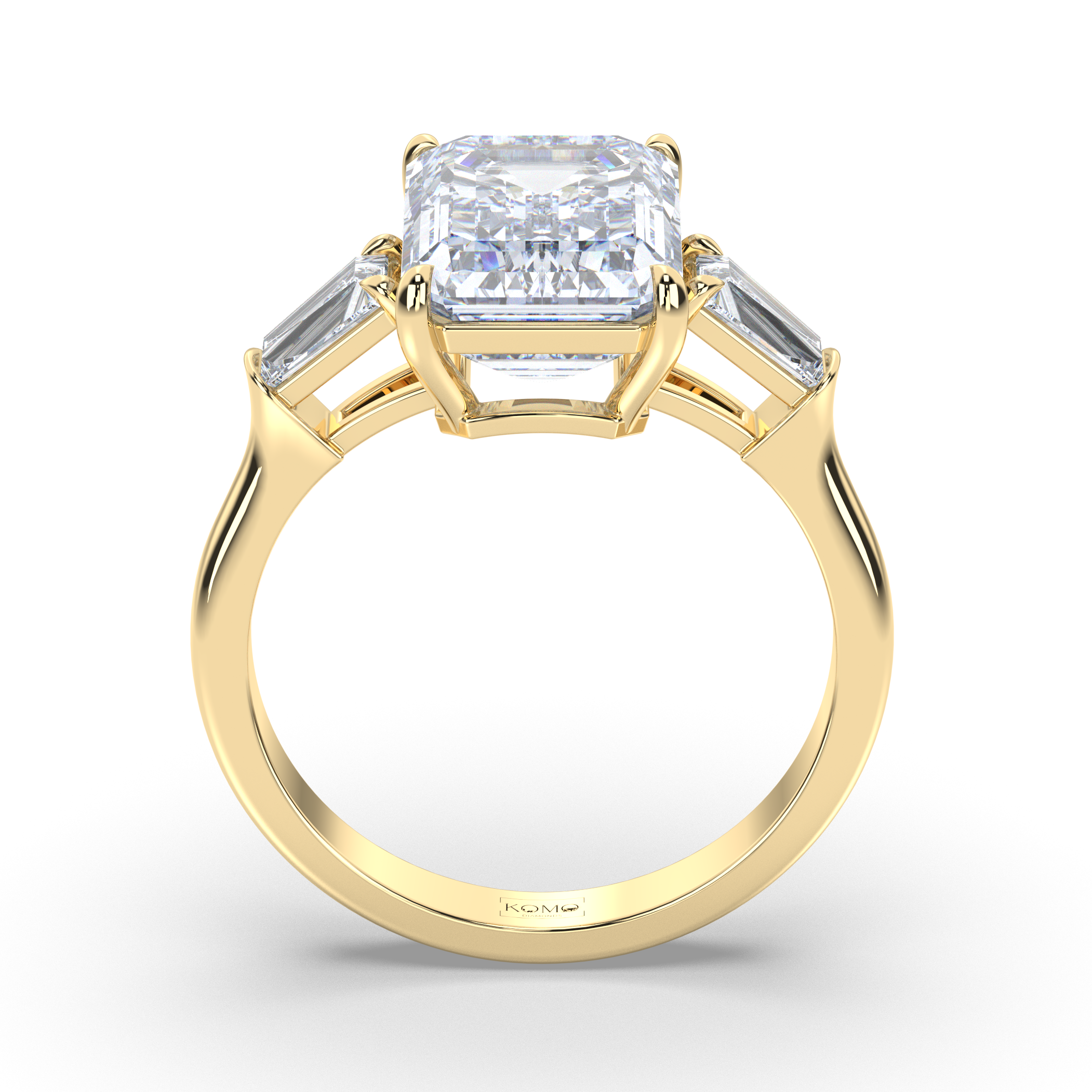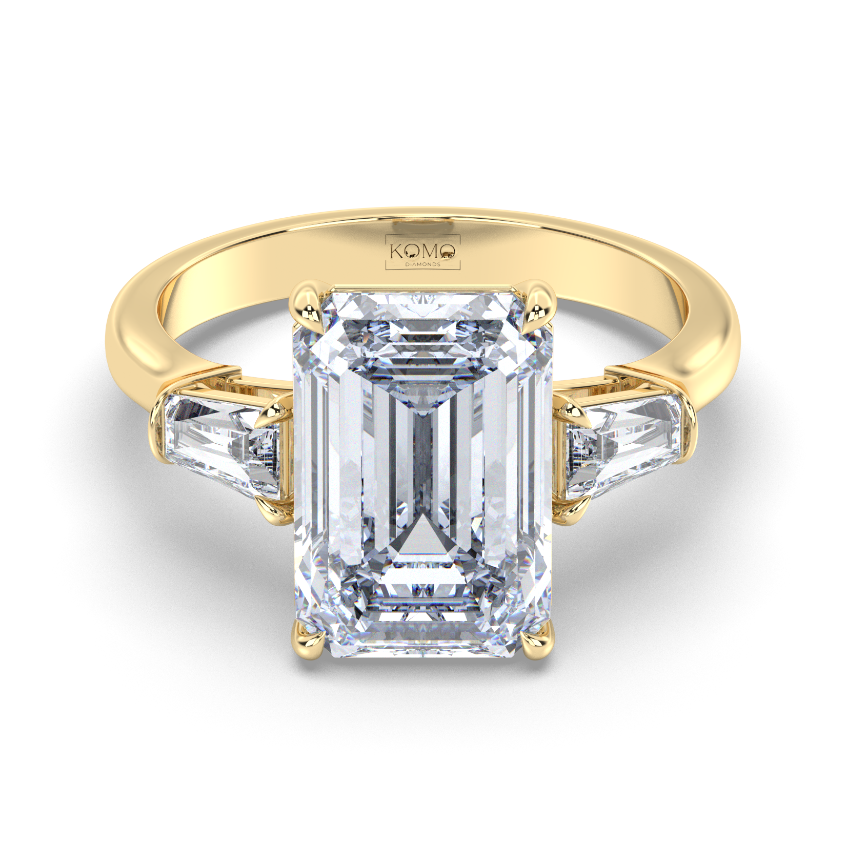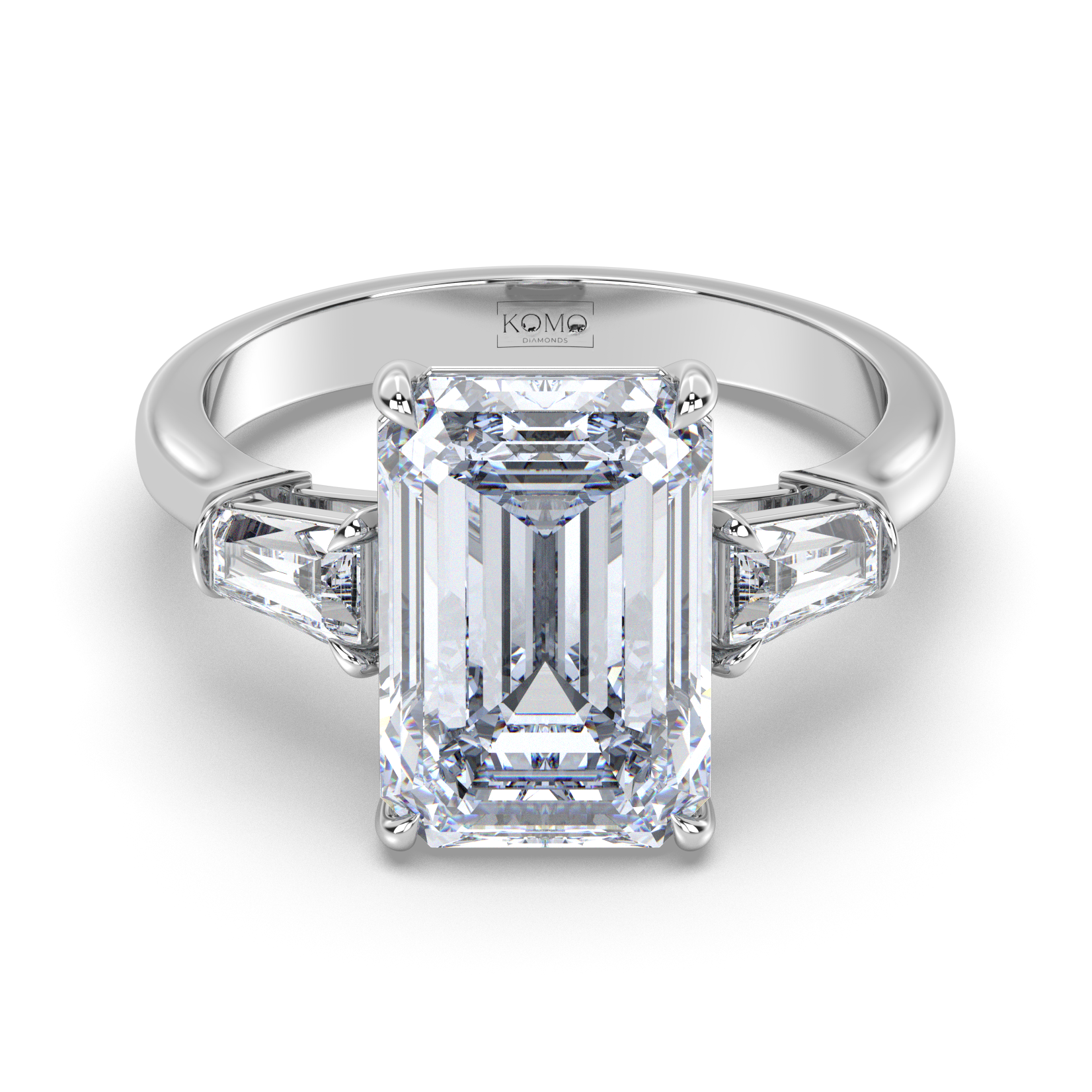 • Art Deco Elegance: Three-stone design with emerald-cut center and tapered baguette lab diamonds embodies architectural sophistication