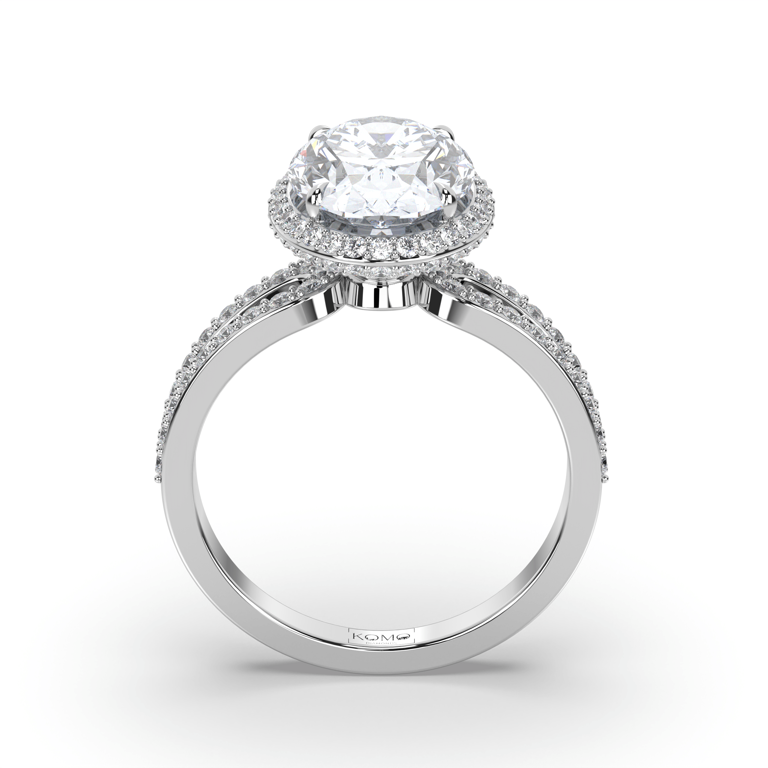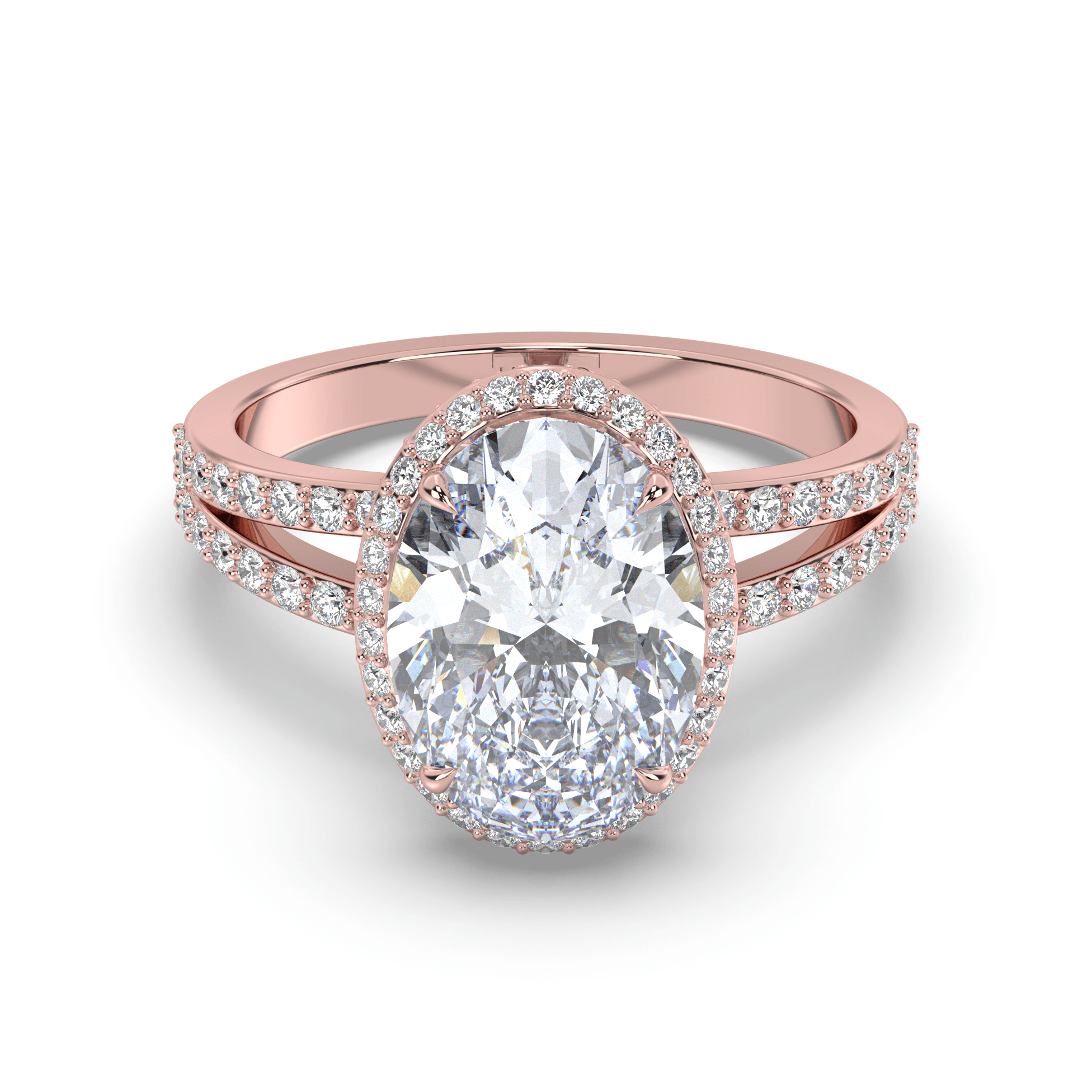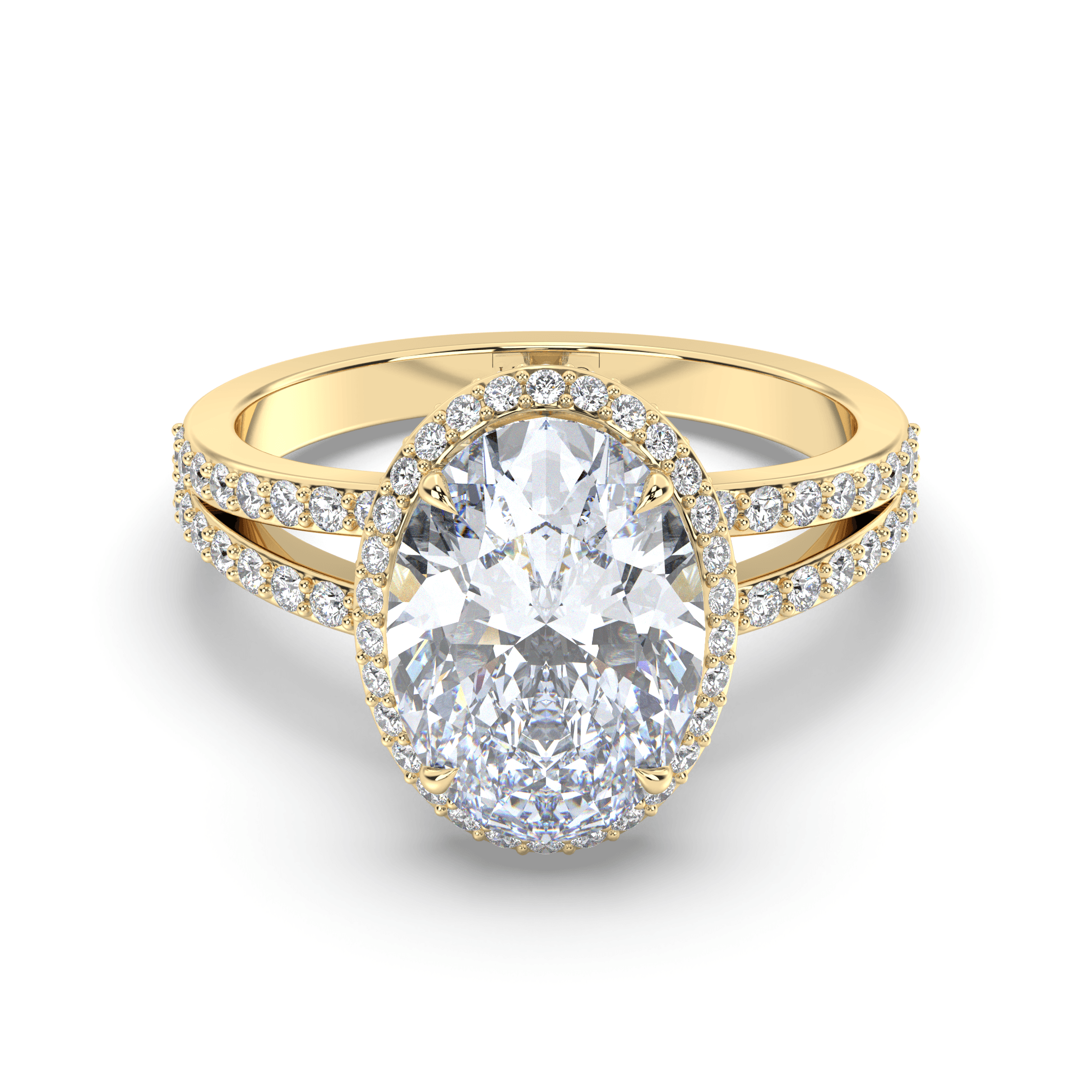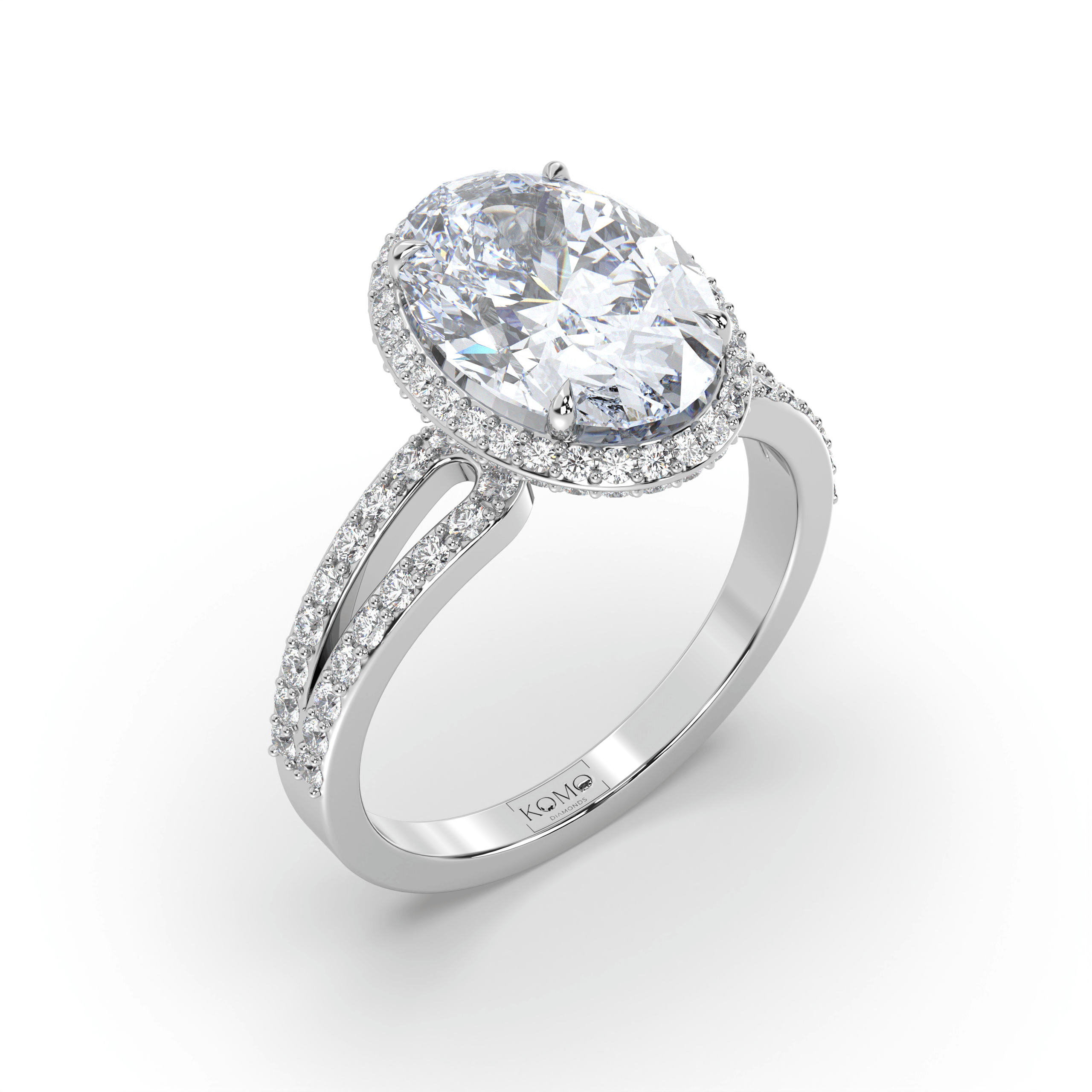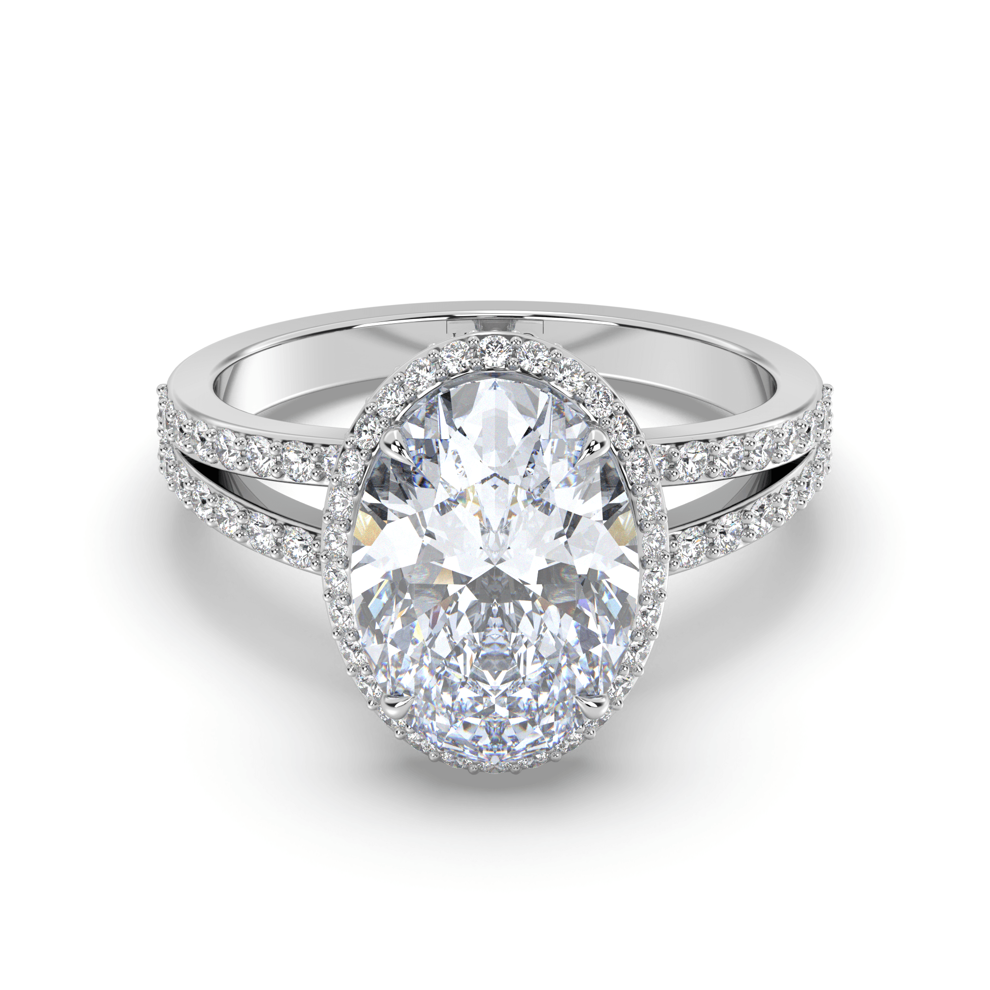 The centerpiece features an IGI-certified oval lab grown diamond from the total weight range of 2.00 to 7.00 carats, in exceptional G+ color and VS1+ clarity. The oval cut's elongated silhouette maximizes visual impact while the double halo design creates layered geometric frames that amplify the center stone's brilliance through calculated proportions.