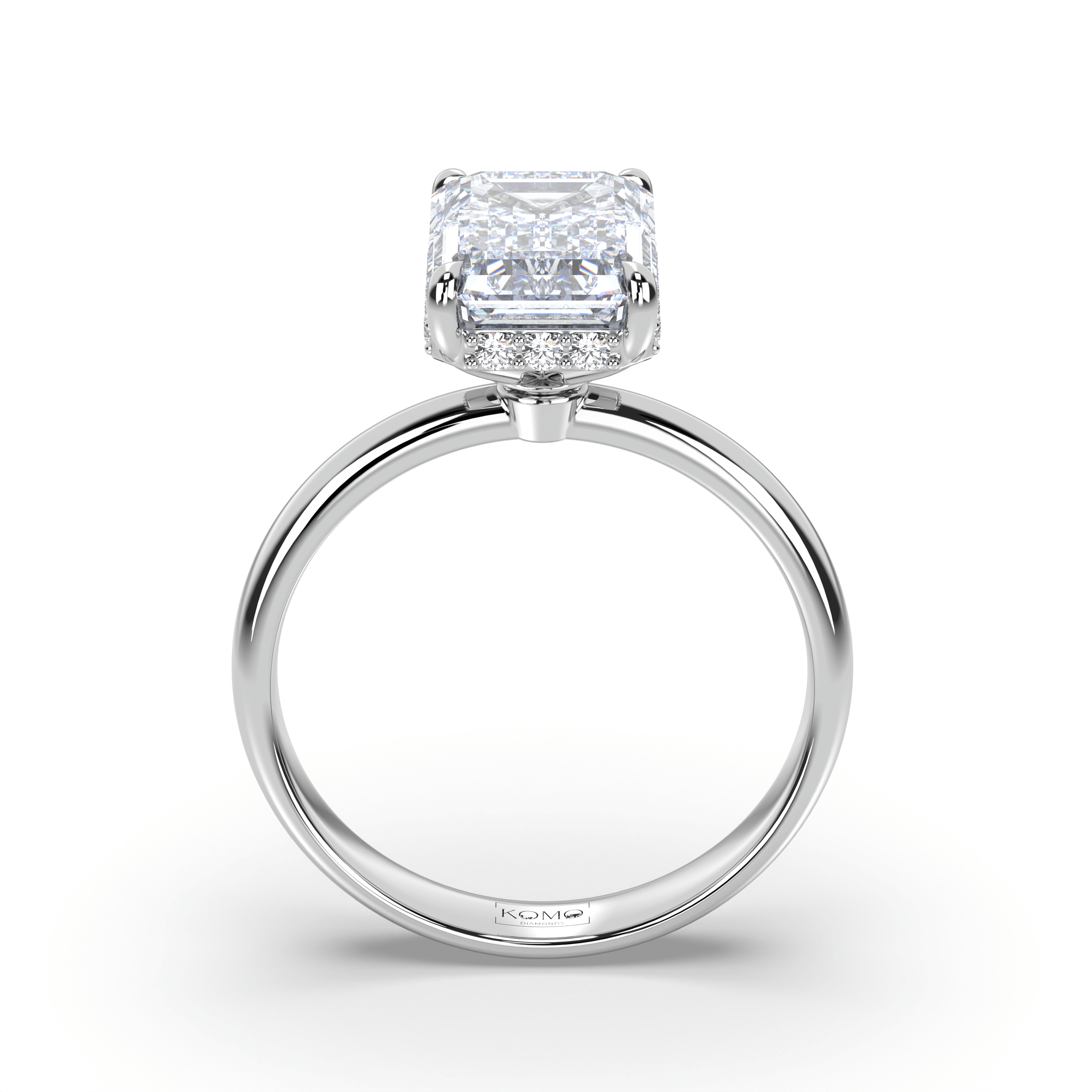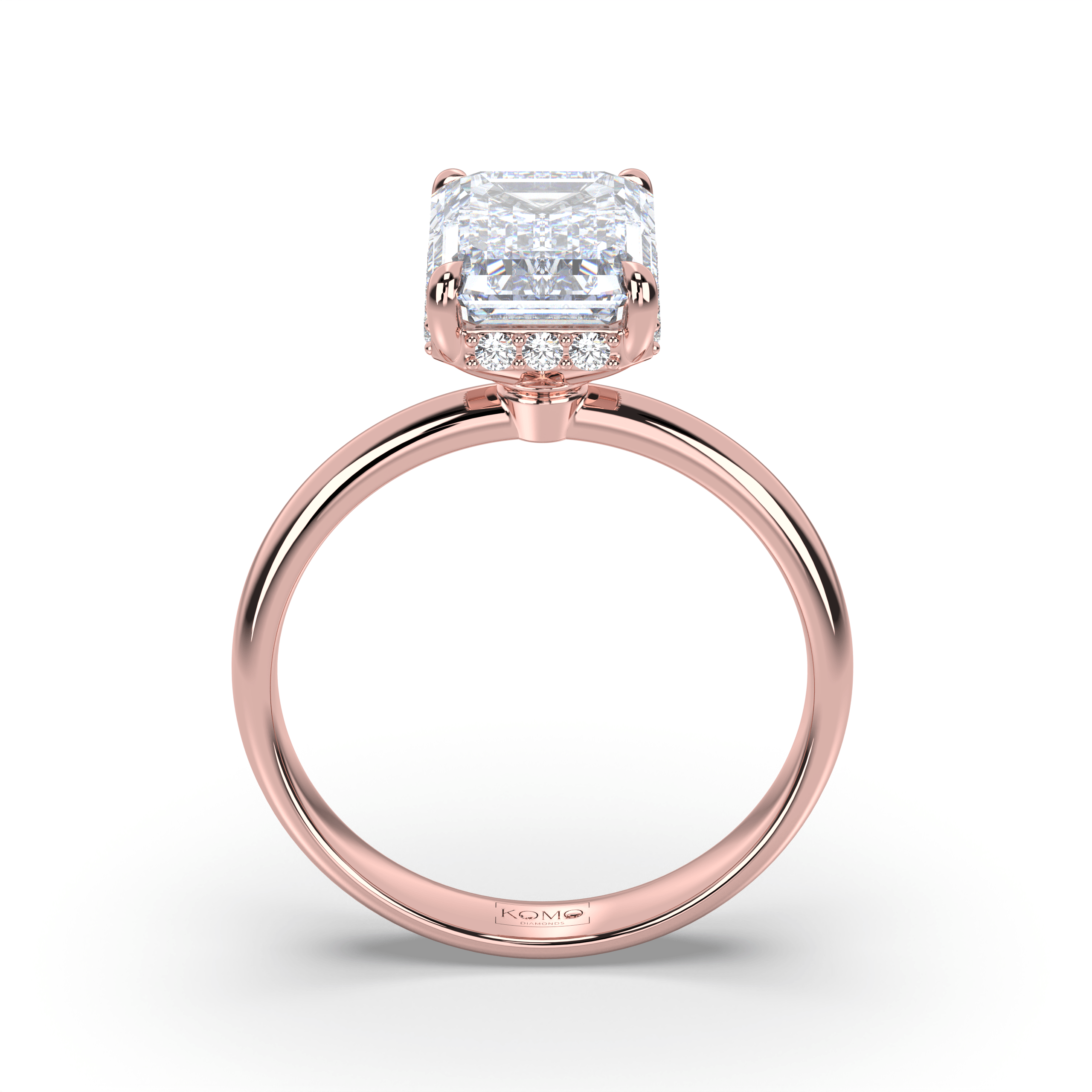 The hidden halo contains precision-set round lab-grown diamonds (0.14-0.22 carats total) with pristine E color and VS1 clarity. Positioned beneath the emerald-cut stone, these diamonds enhance brilliance while maintaining the solitaire aesthetic that defines the collection's commitment to edge-to-edge clarity and sophisticated design.