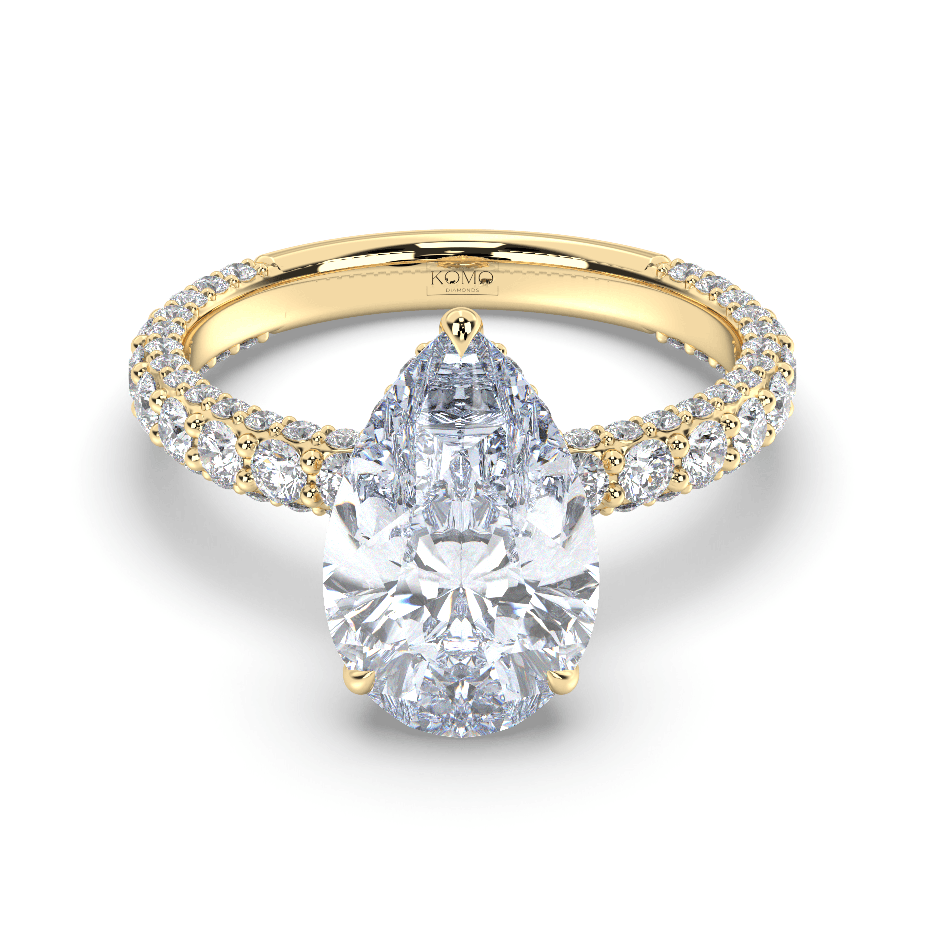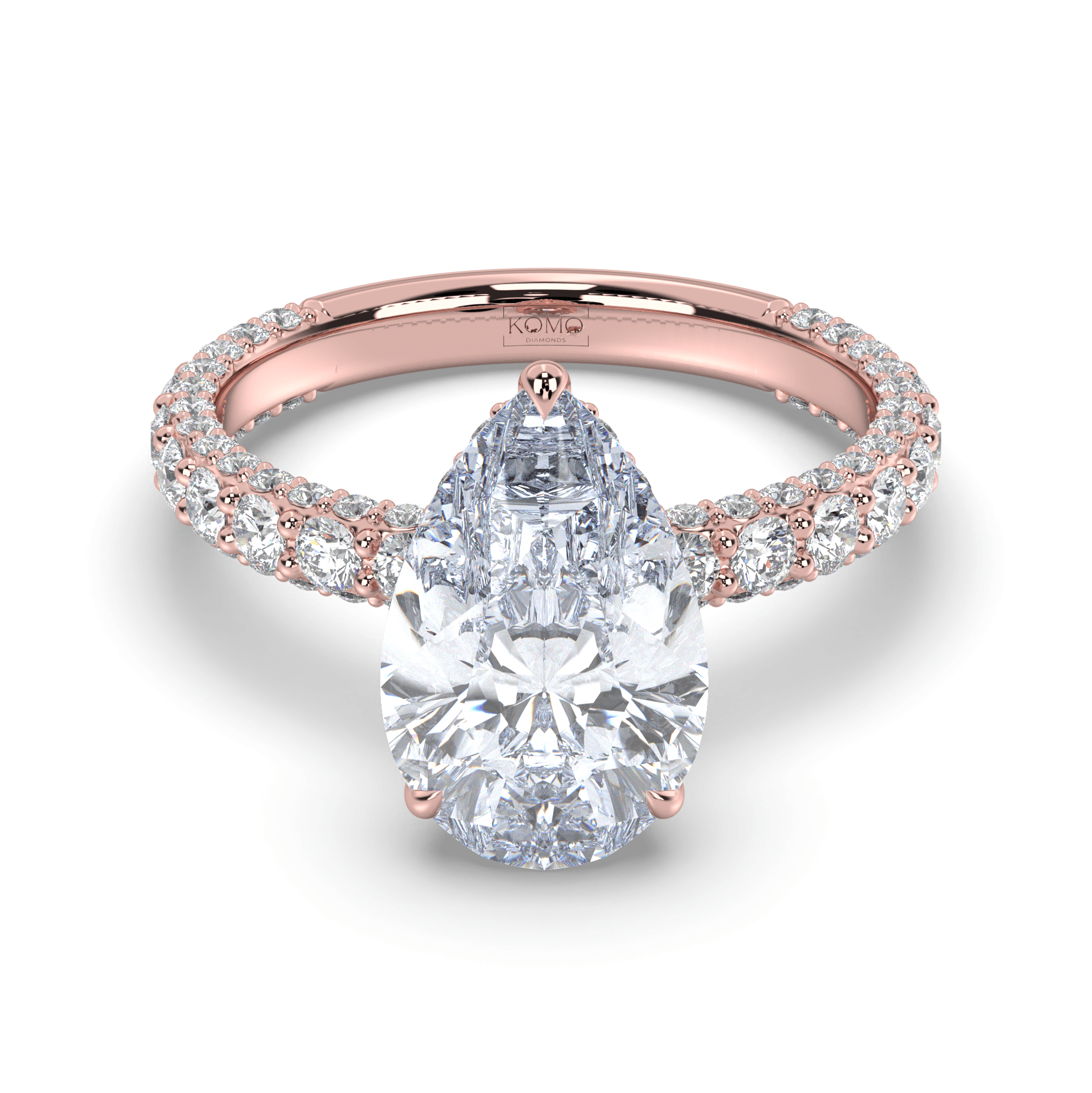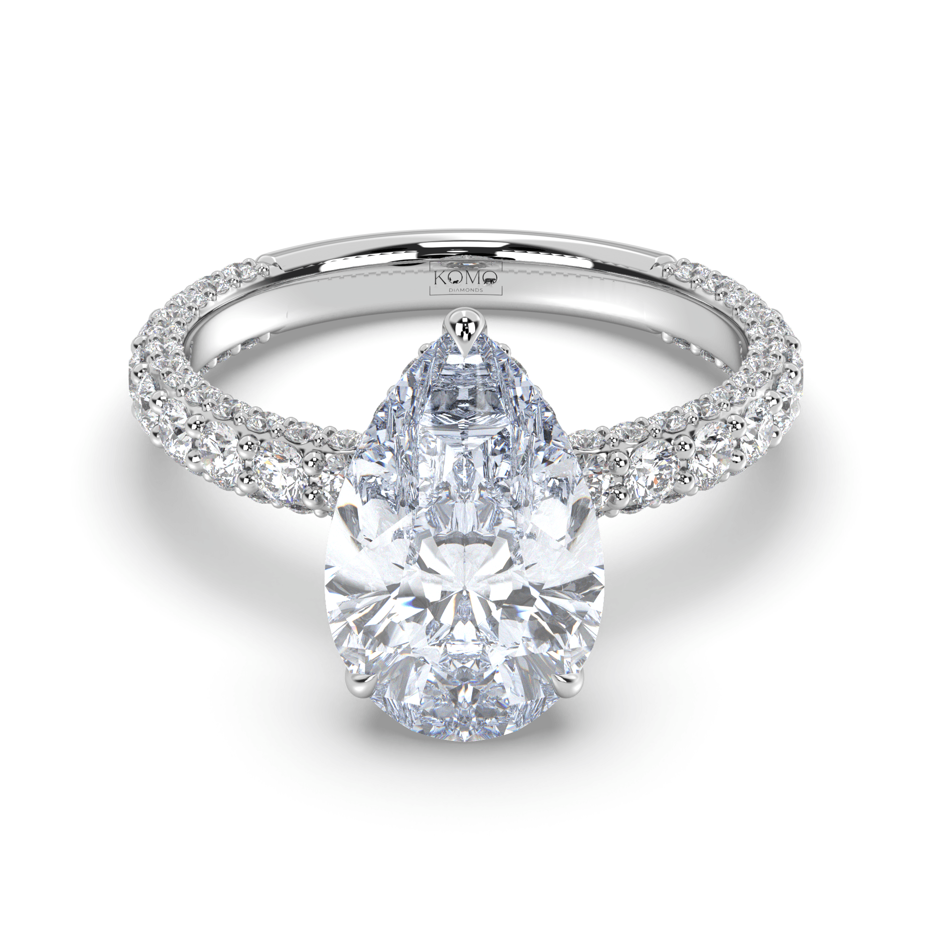 The pavé shank contains 1.25-1.35 carats of premium round lab-grown diamonds with pristine E color and VS1 clarity, creating continuous sparkle that enhances the pear diamond's natural elegance. This sophisticated combination delivers maximum light performance while ensuring comfortable daily wear.