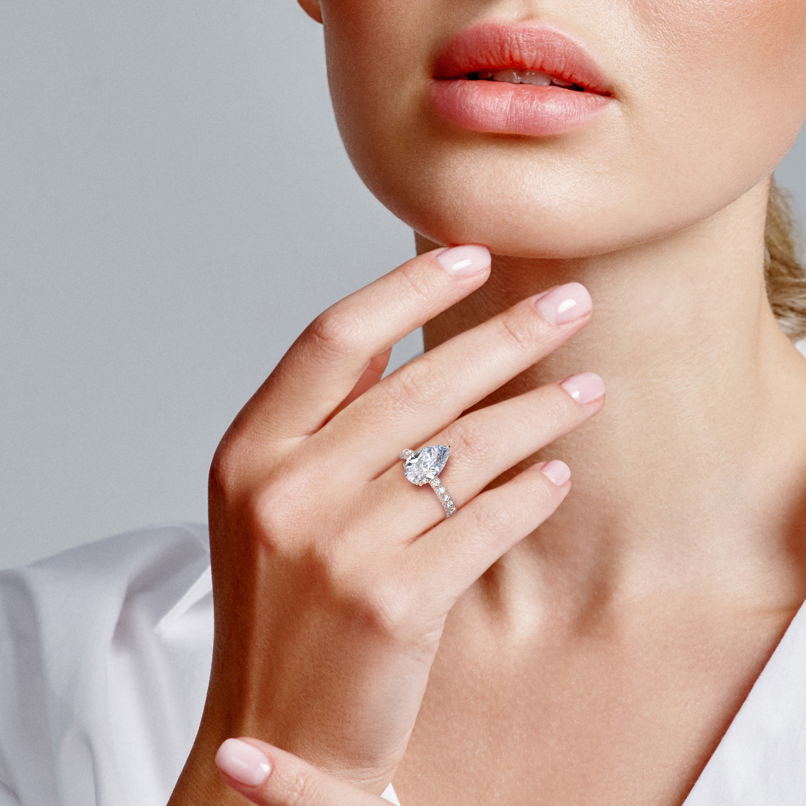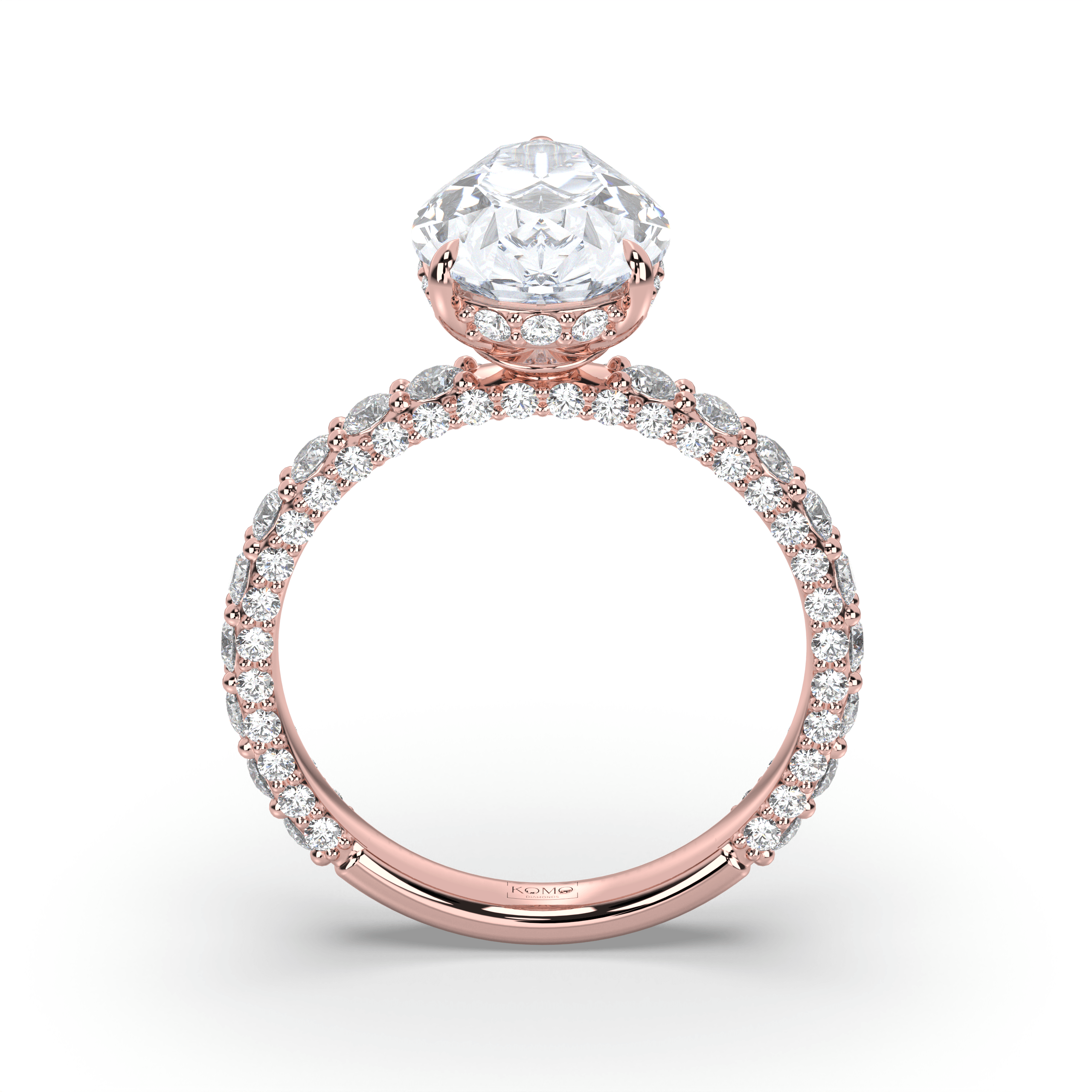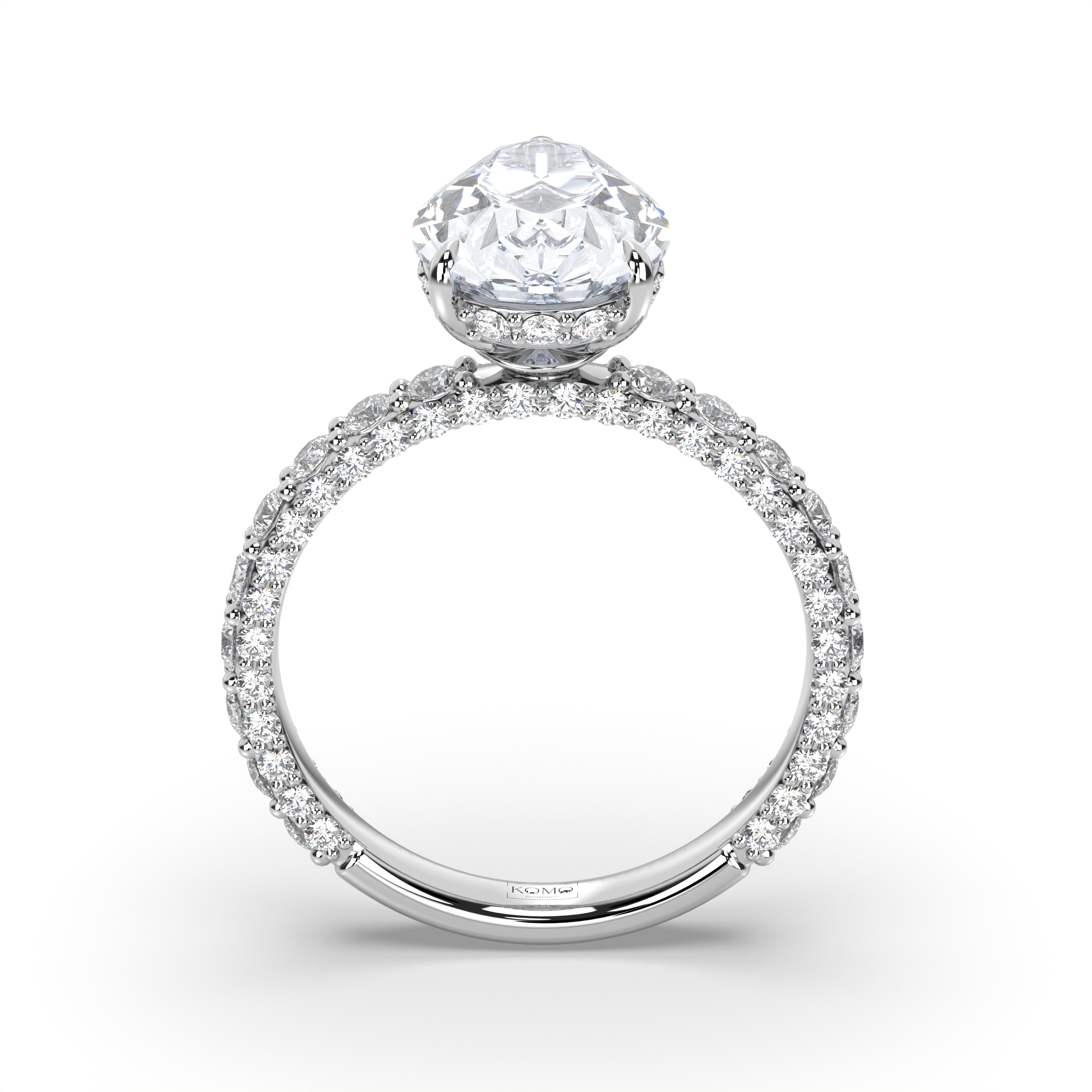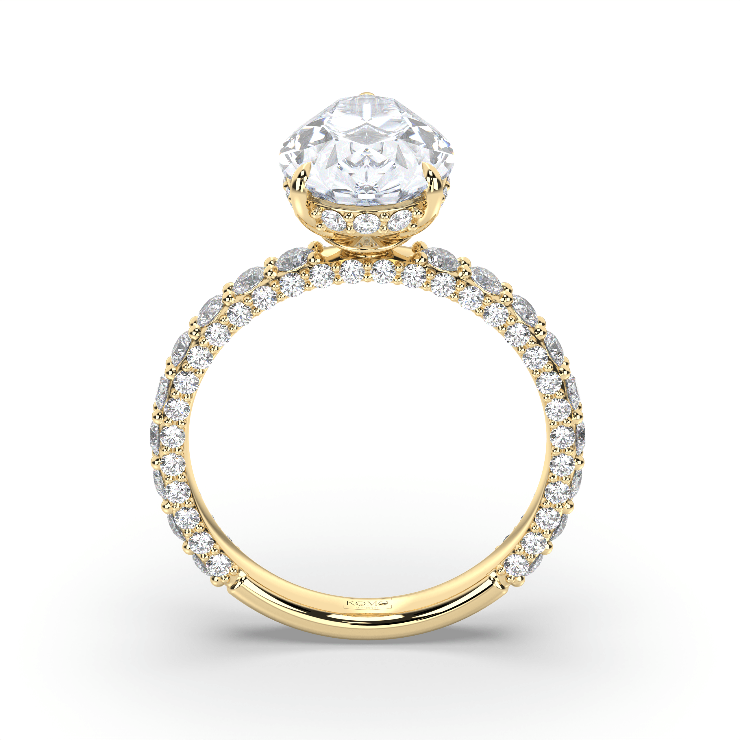 The pavé shank contains 1.25-1.35 carats of premium round lab-grown diamonds with pristine E color and VS1 clarity, creating continuous sparkle that enhances the pear diamond's natural elegance. This sophisticated combination delivers maximum light performance while ensuring comfortable daily wear.