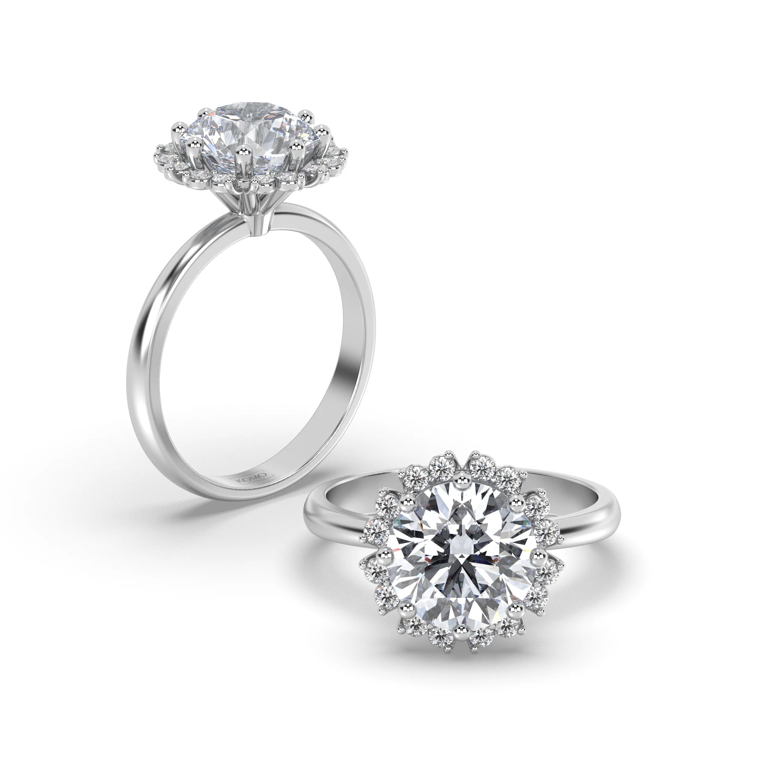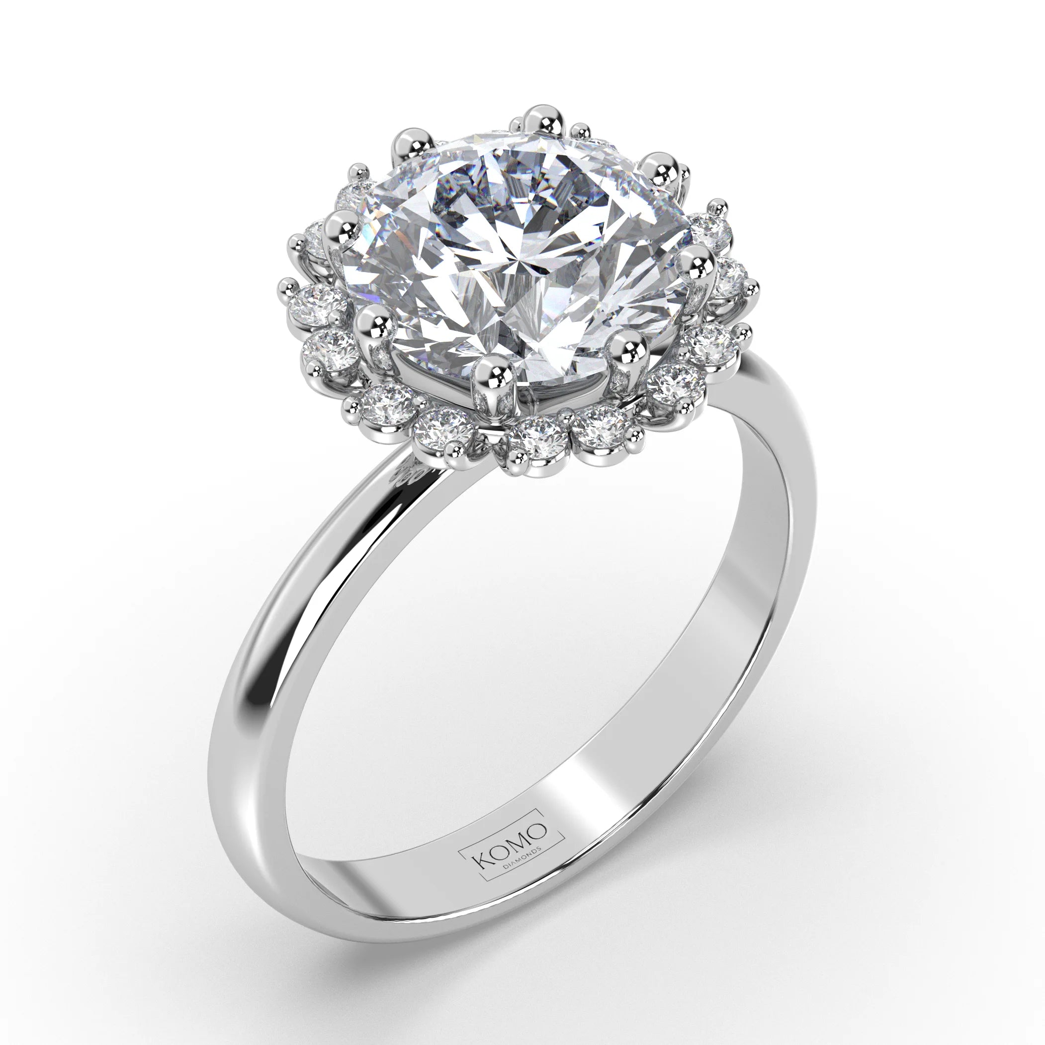 Meet Astra, where ethereal beauty meets radiant brilliance in a breathtaking celebration of light and celestial wonder. This exquisite round brilliant diamond engagement ring from our Celestial collection captures the essence of starlight with its glowing halo design, crafted for the woman who appreciates effortless elegance and luminous sophistication.