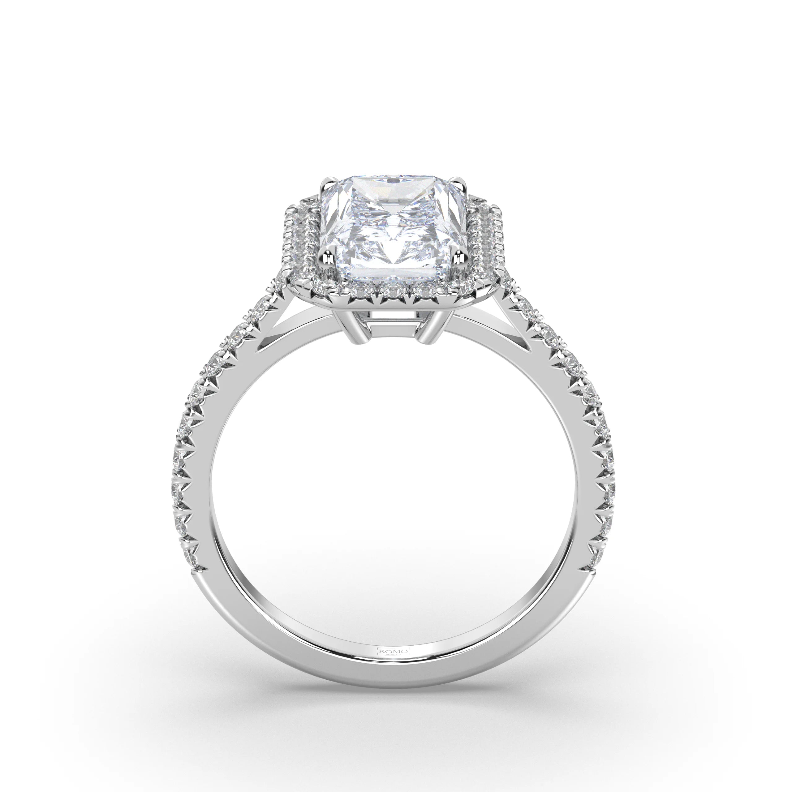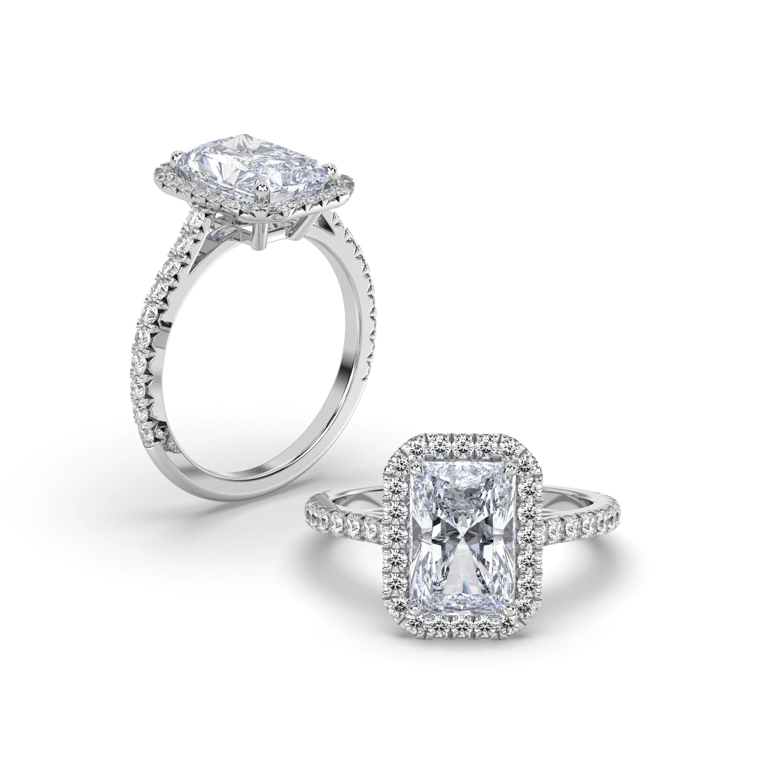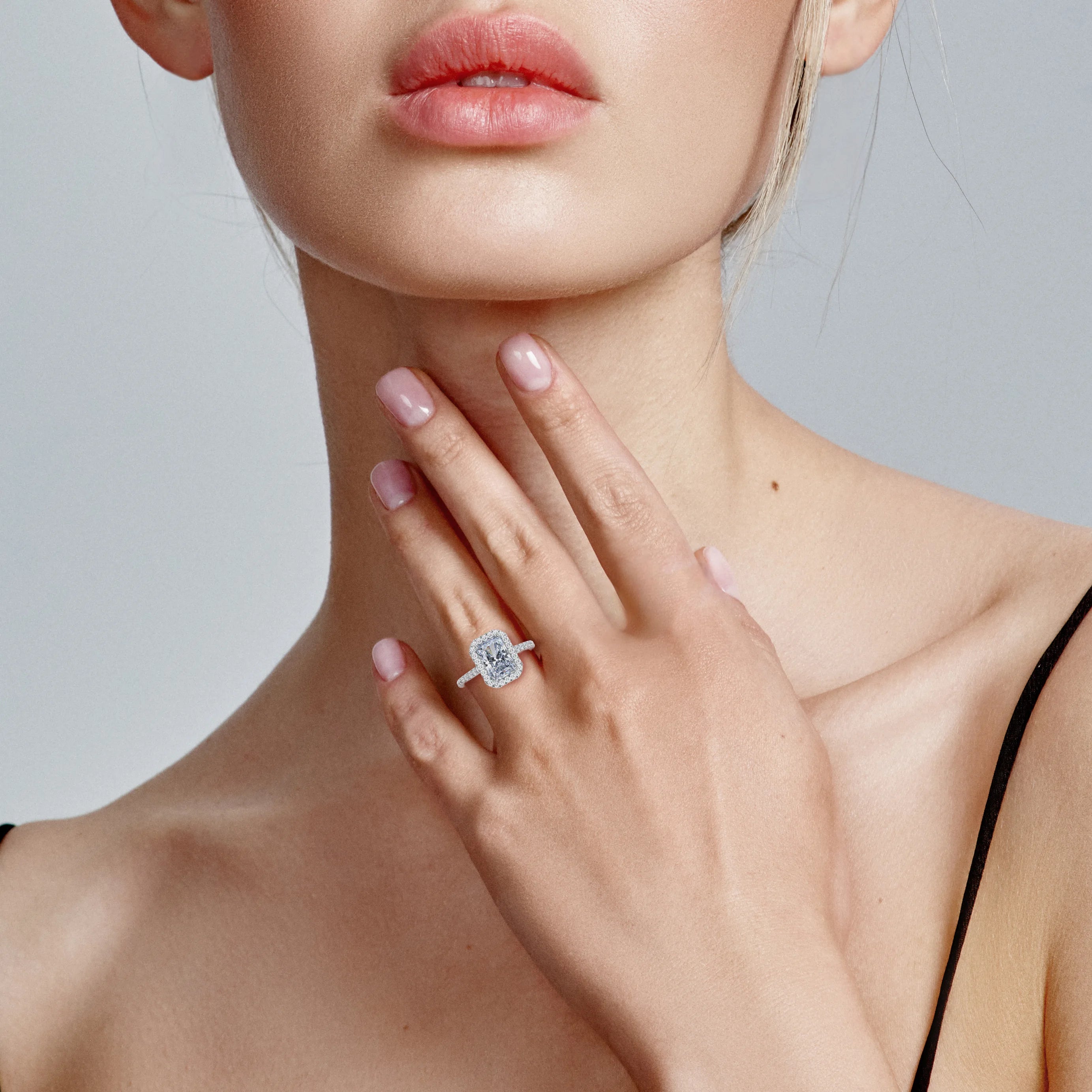 - Deco-Inspired Brilliance: Radiant-cut center stone paired with geometric halo creates perfect architectural symmetry