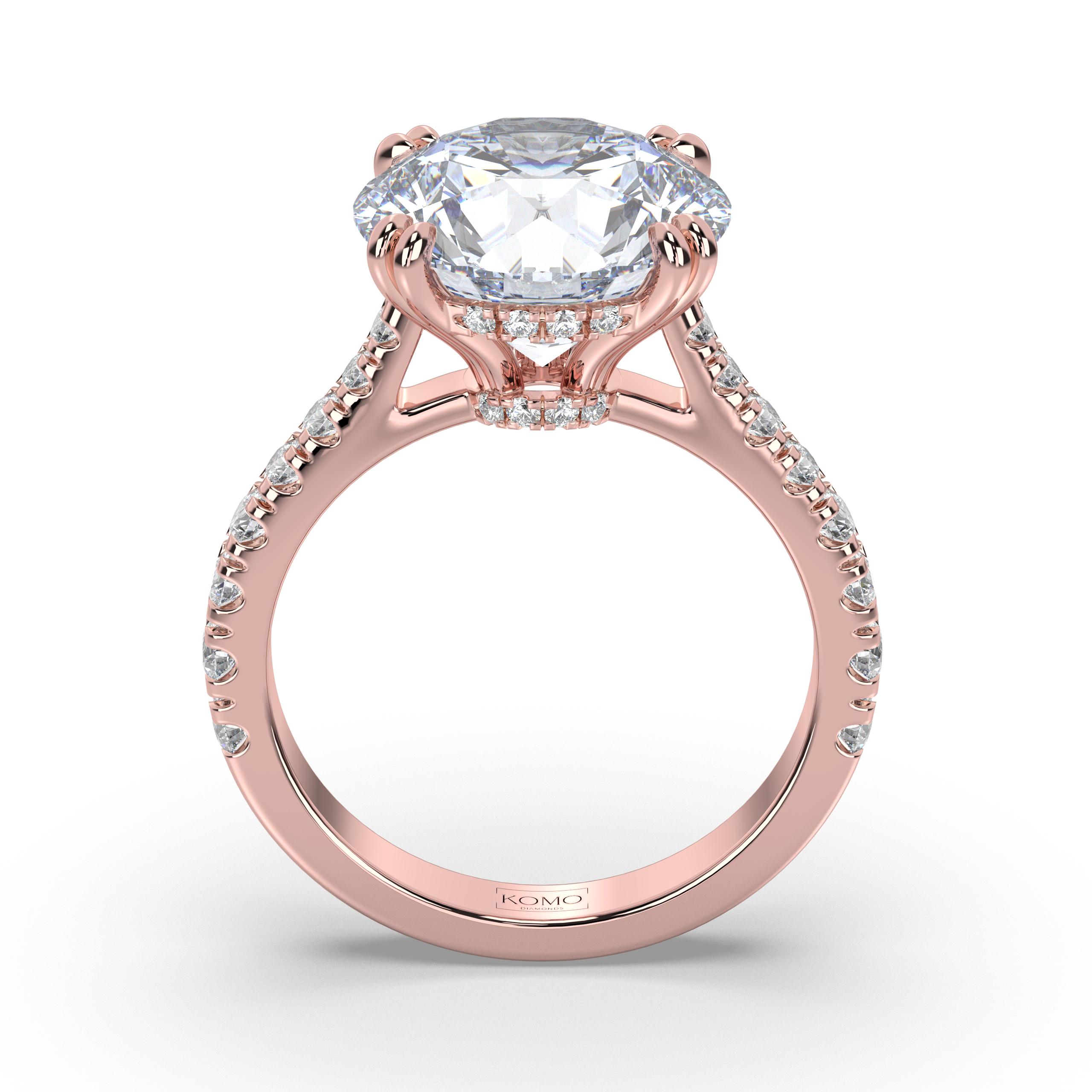 The design celebrates celestial luminosity with 40 expertly set round diamonds totaling 0.54 carats, forming both a hidden halo beneath the center stone and extending down the band in micro-pavé formation. These pristine E color, VS1 clarity diamonds create continuous sparkle that reads like scattered stardust, enhancing the center stone's exceptional brilliance while maintaining that signature floating effect.