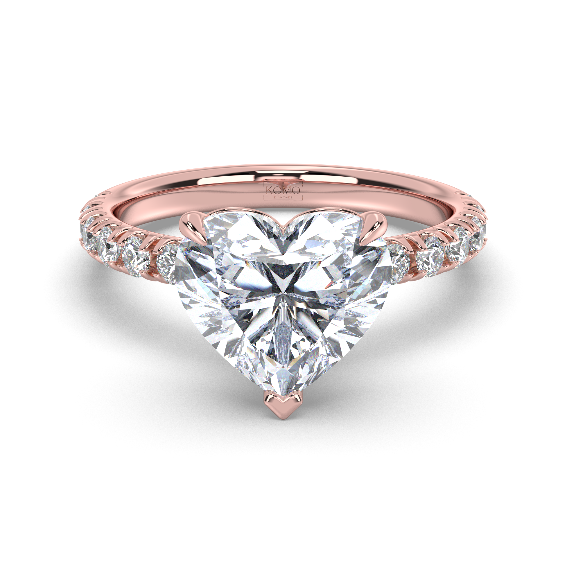 At the center of the Juliette lies a magnificent 1.00 to 3.00 carat heart-shaped lab-grown diamond with exceptional G+ color and VS1+ clarity, certified by IGI for guaranteed quality. The heart cut is one of the most technically challenging shapes to master, requiring perfect symmetry and proportion to achieve its distinctive romantic silhouette and captivating brilliance.