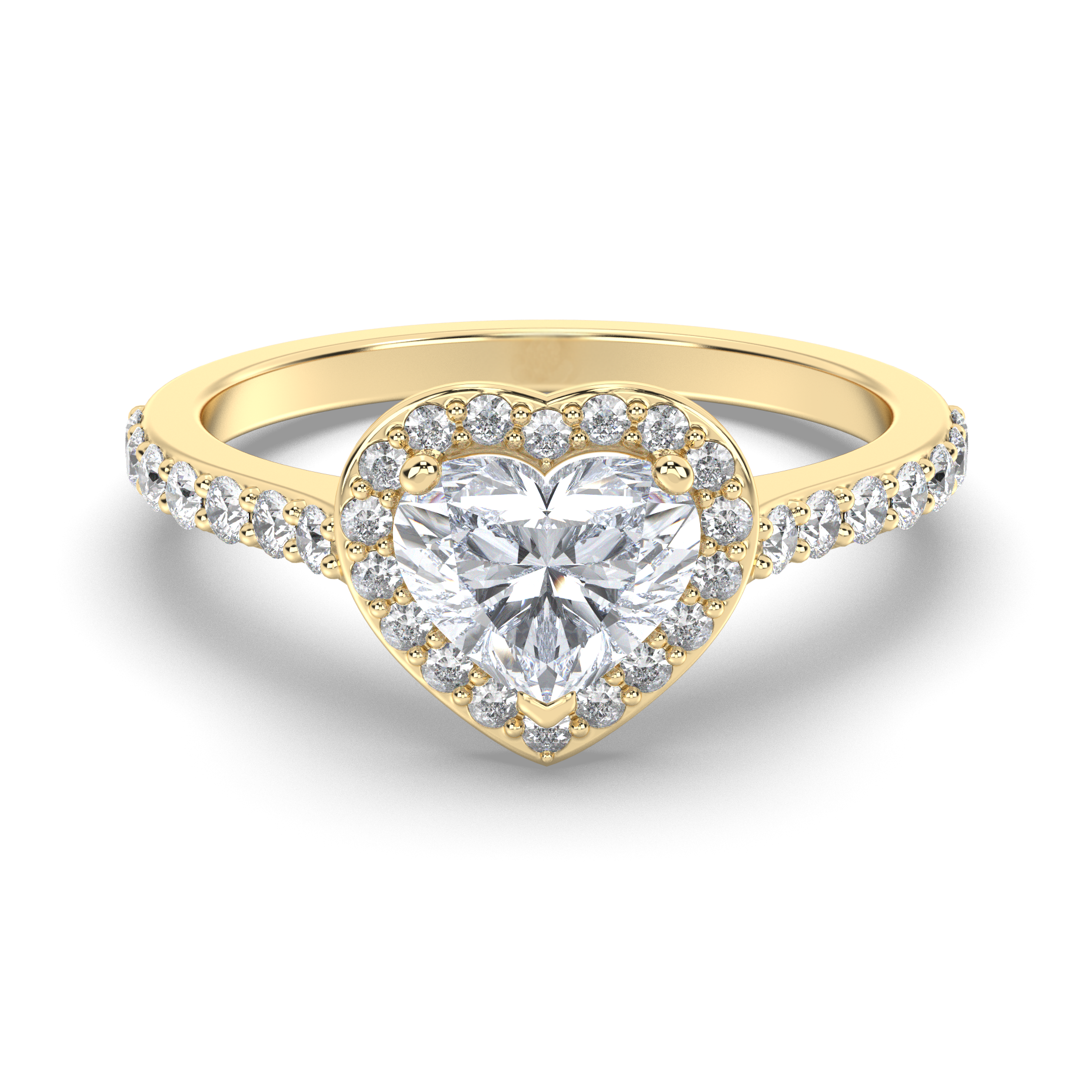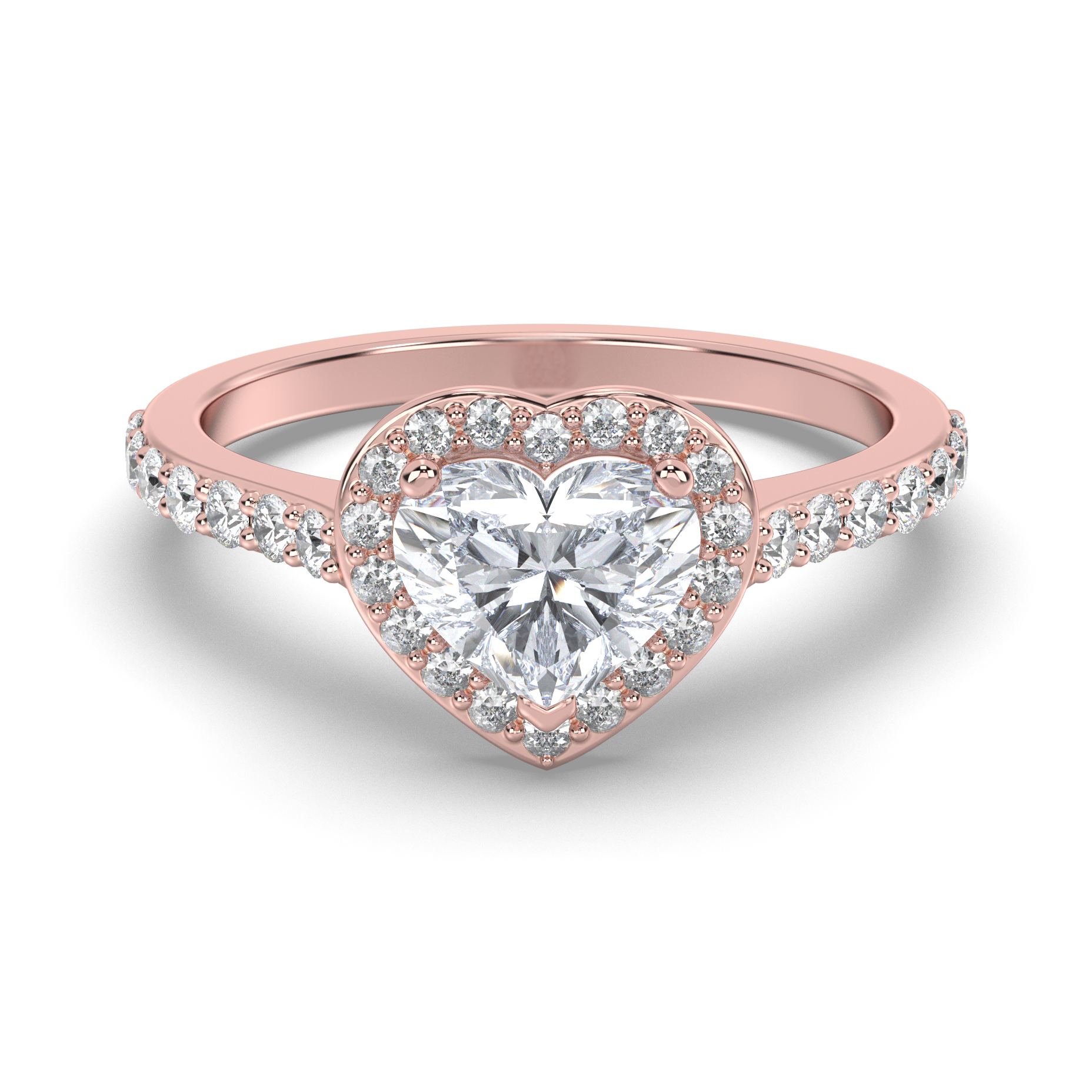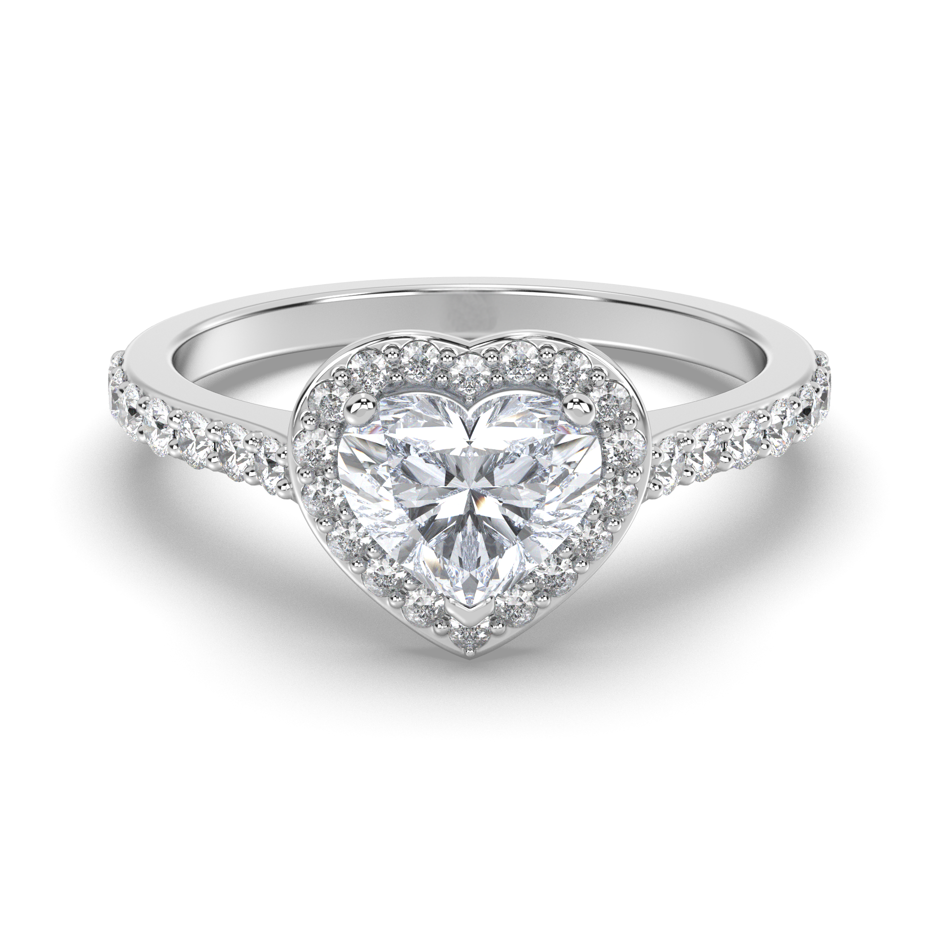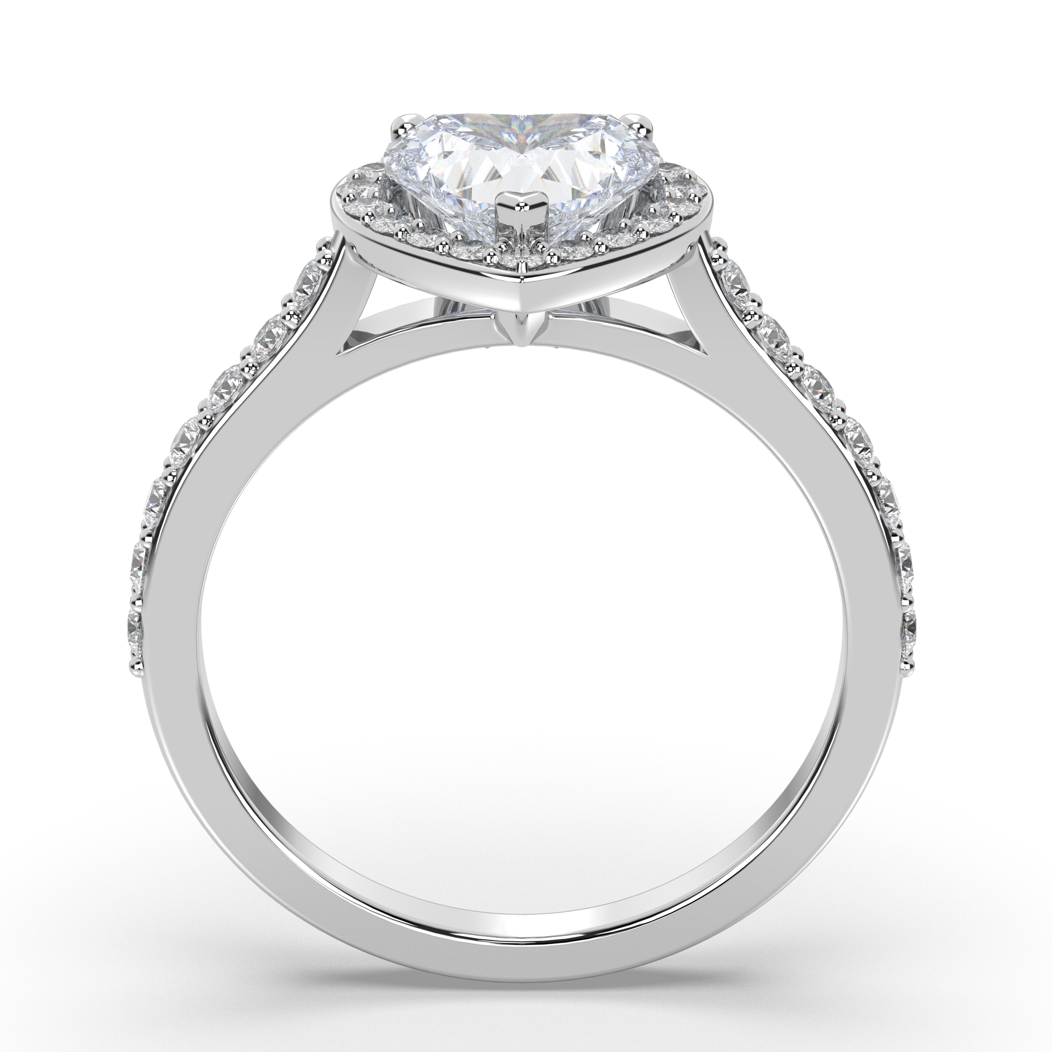 A brilliant halo of 36-50 round lab grown diamonds totaling 0.50-0.68 carats surrounds the heart-shaped center, each featuring pristine E color and VS1 clarity. The pavé band continues the sparkle, creating an uninterrupted cascade of light that enhances the romantic heart silhouette.