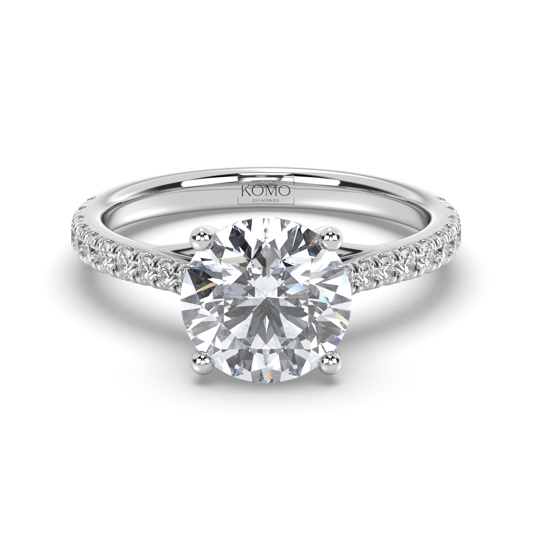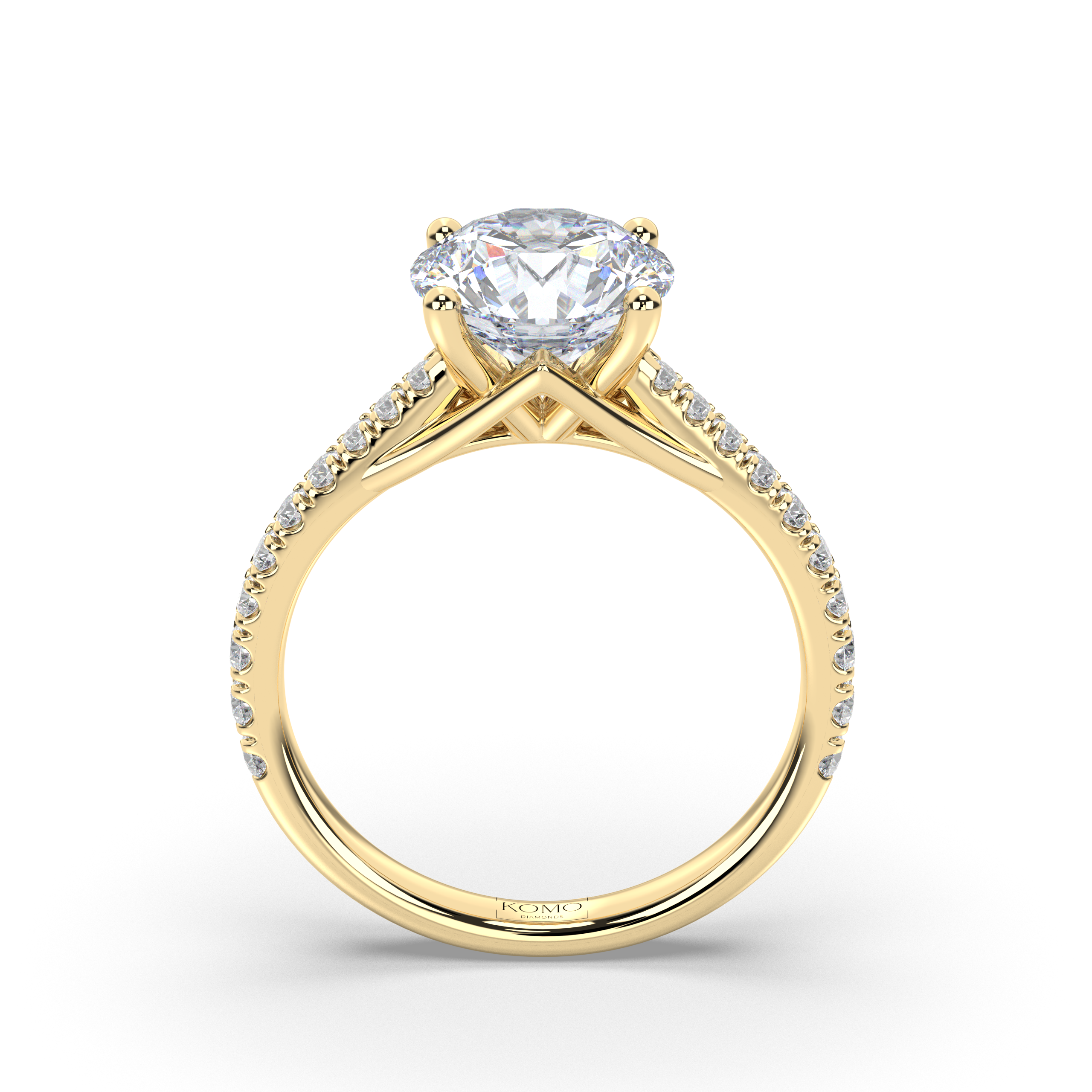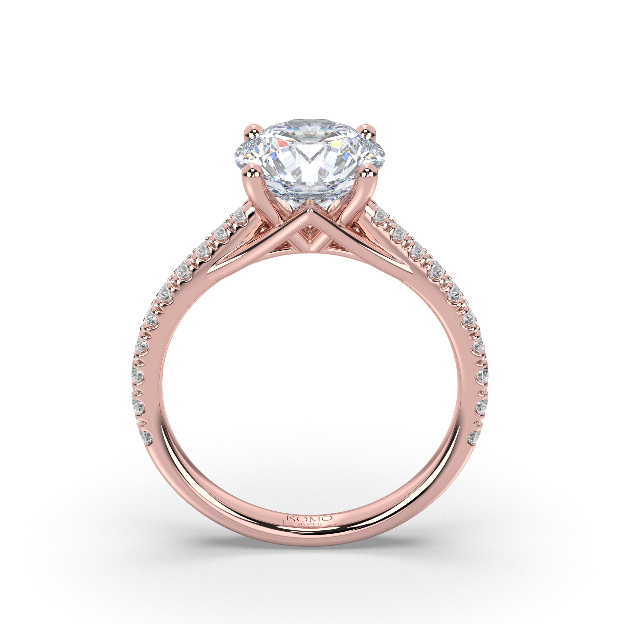 The design celebrates celestial luminosity with 20 expertly set round diamonds totaling 0.30 carats, flowing along the cathedral shoulders and extending down the band. These pristine E color, VS1 clarity diamonds create continuous sparkle that enhances the center stone's brilliance while the elevated setting allows maximum light to flow through from every angle, maintaining that signature floating quality.