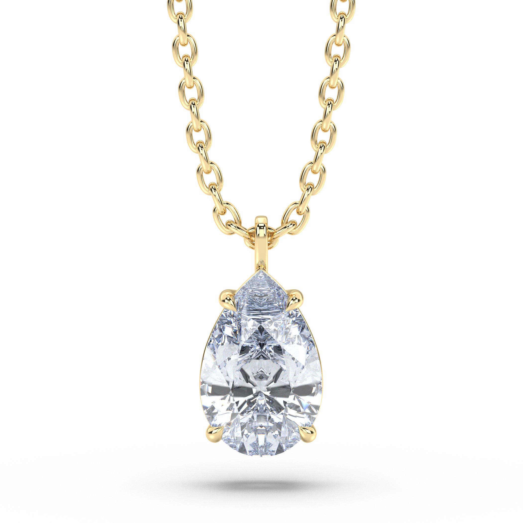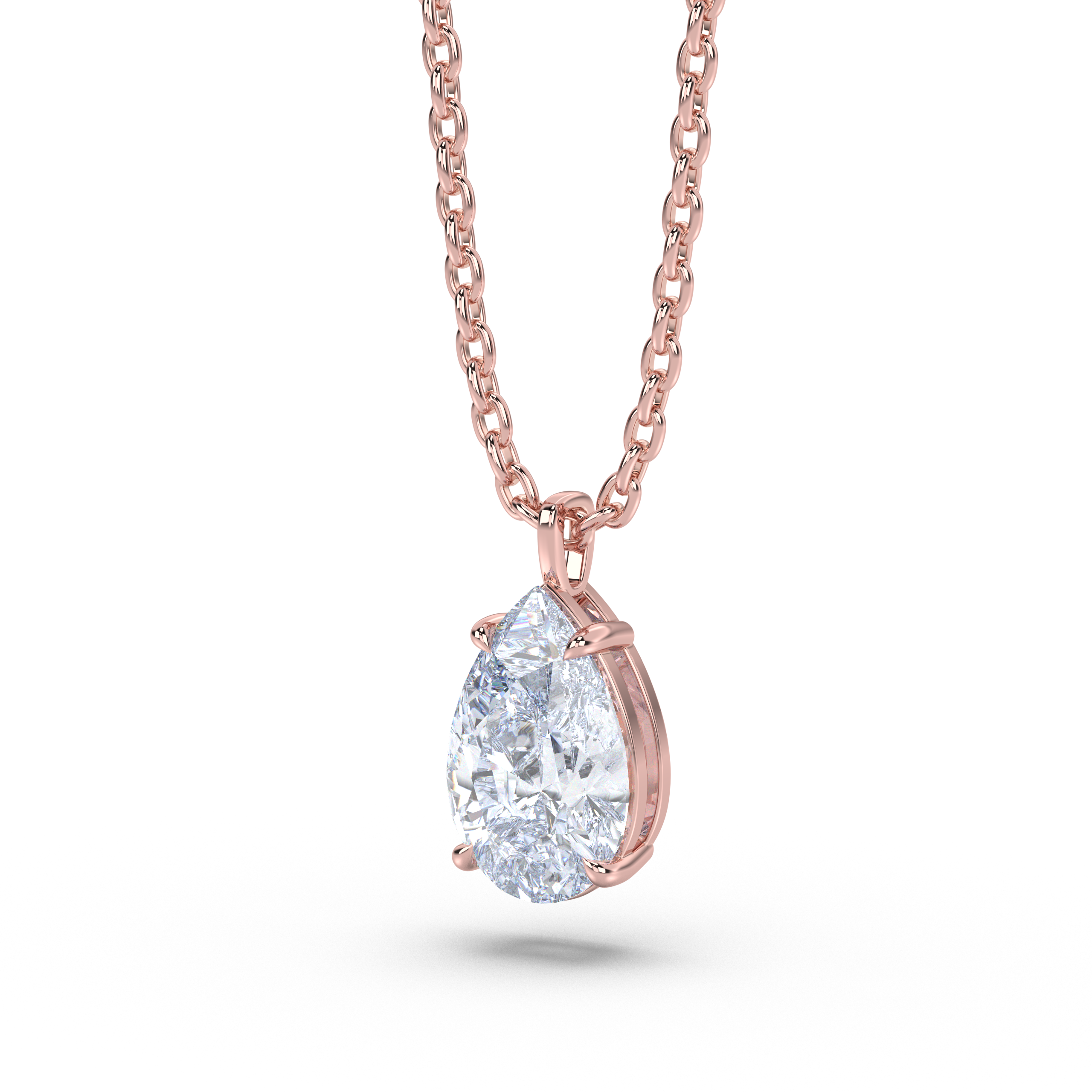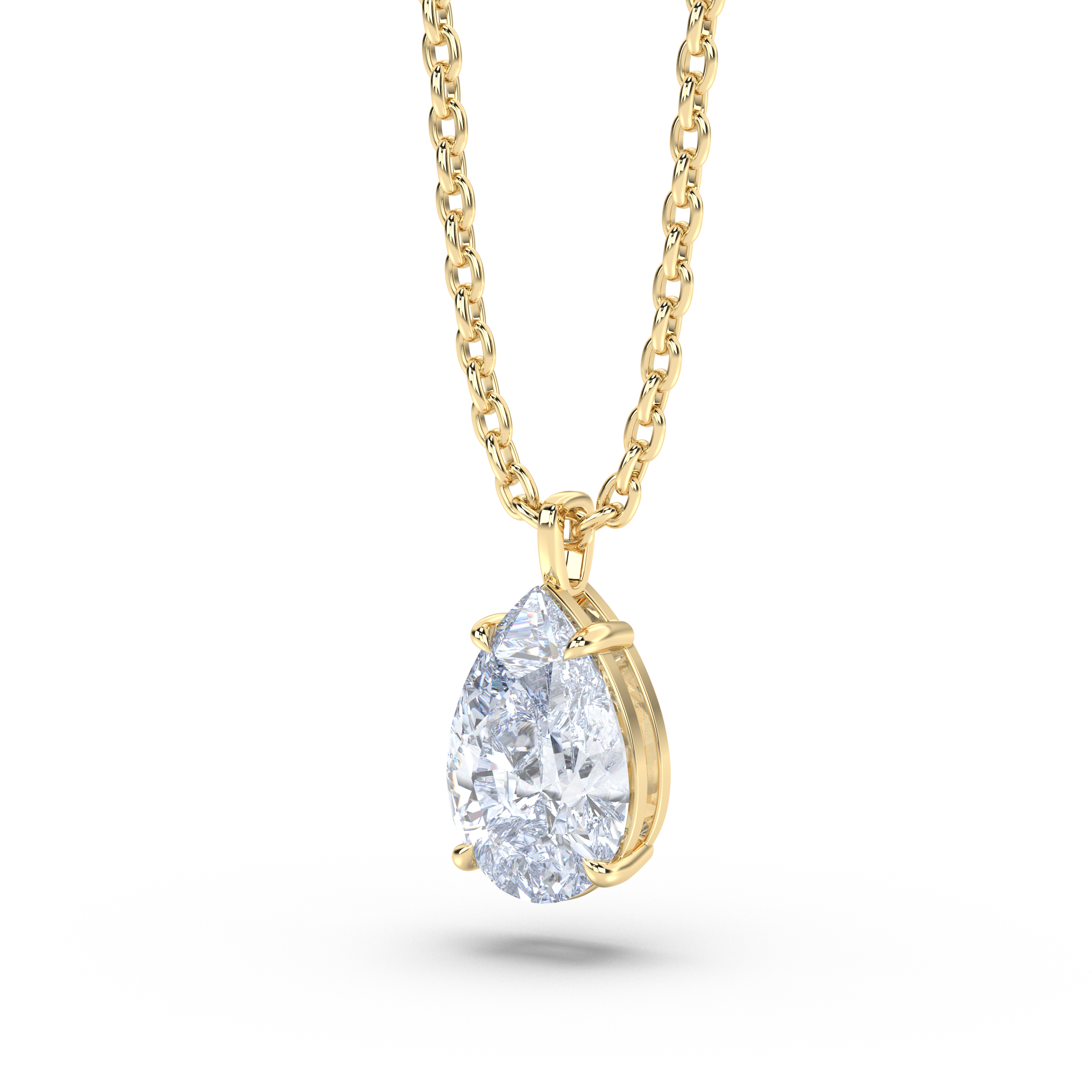 The centerpiece features an IGI-certified pear-cut lab grown diamond, ranging from 2.00 to 7.00 carats, in exceptional G+ color and VS1+ clarity. The pear cut's distinctive teardrop silhouette combines brilliant fire with elongated grace, creating a pendant that moves beautifully and catches light from every angle.