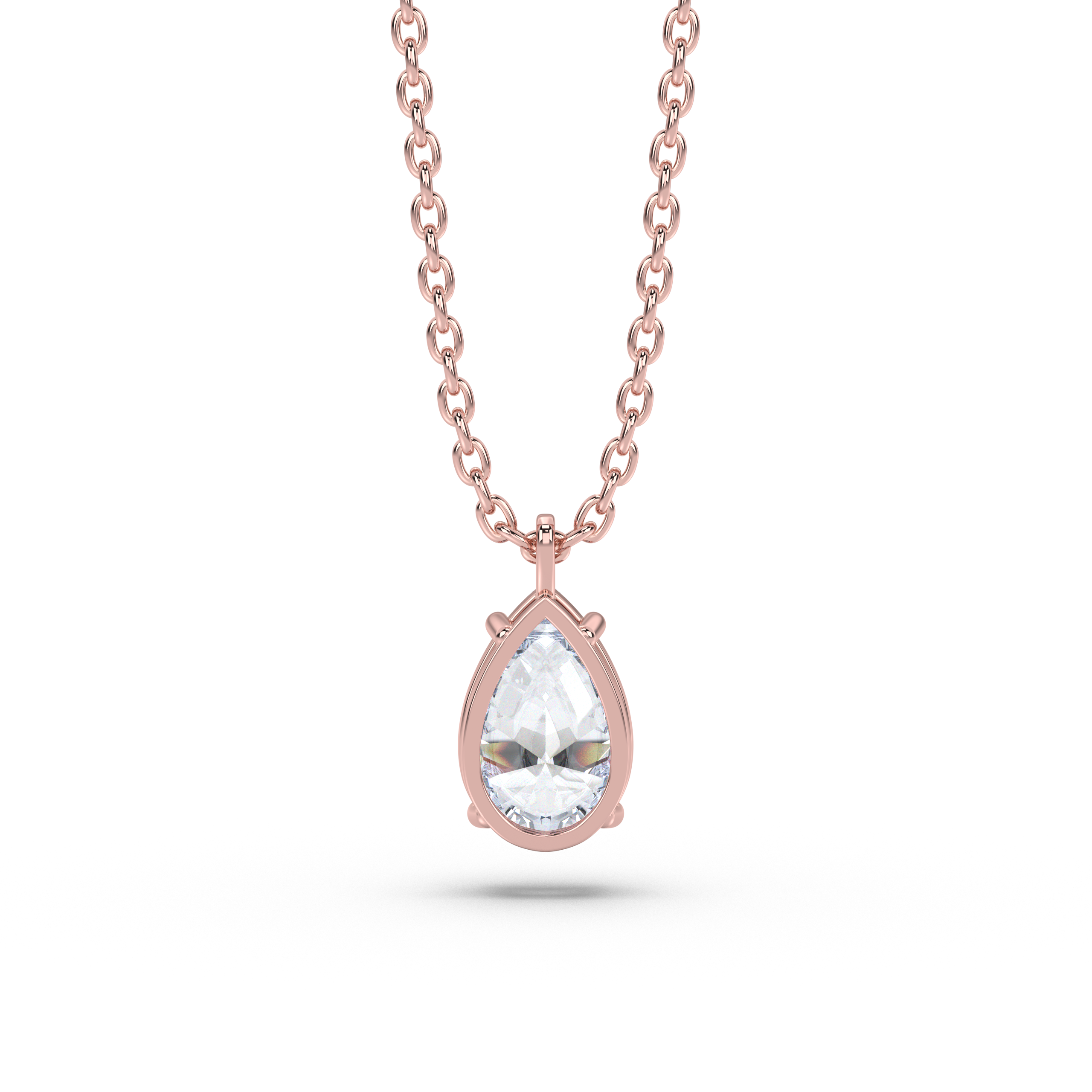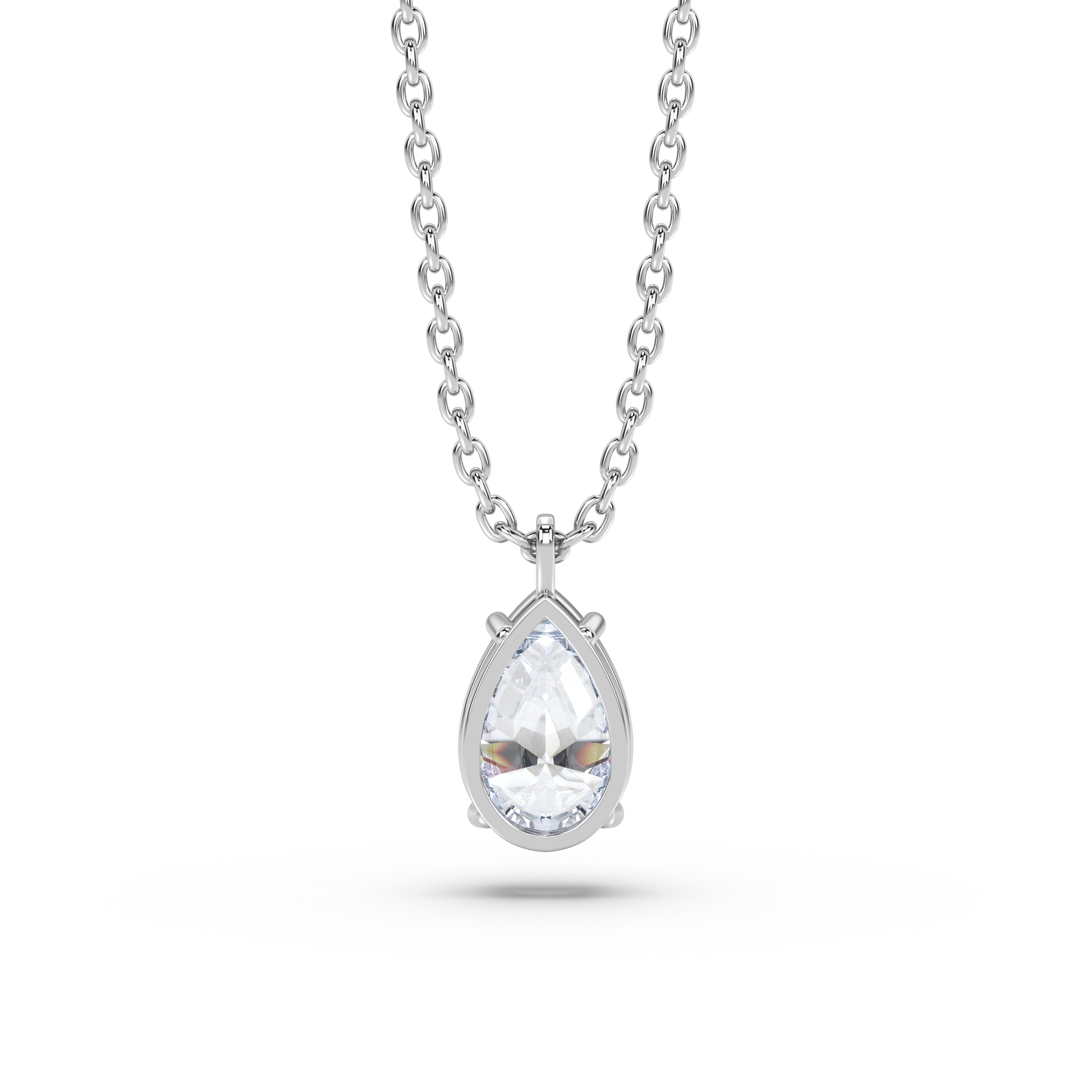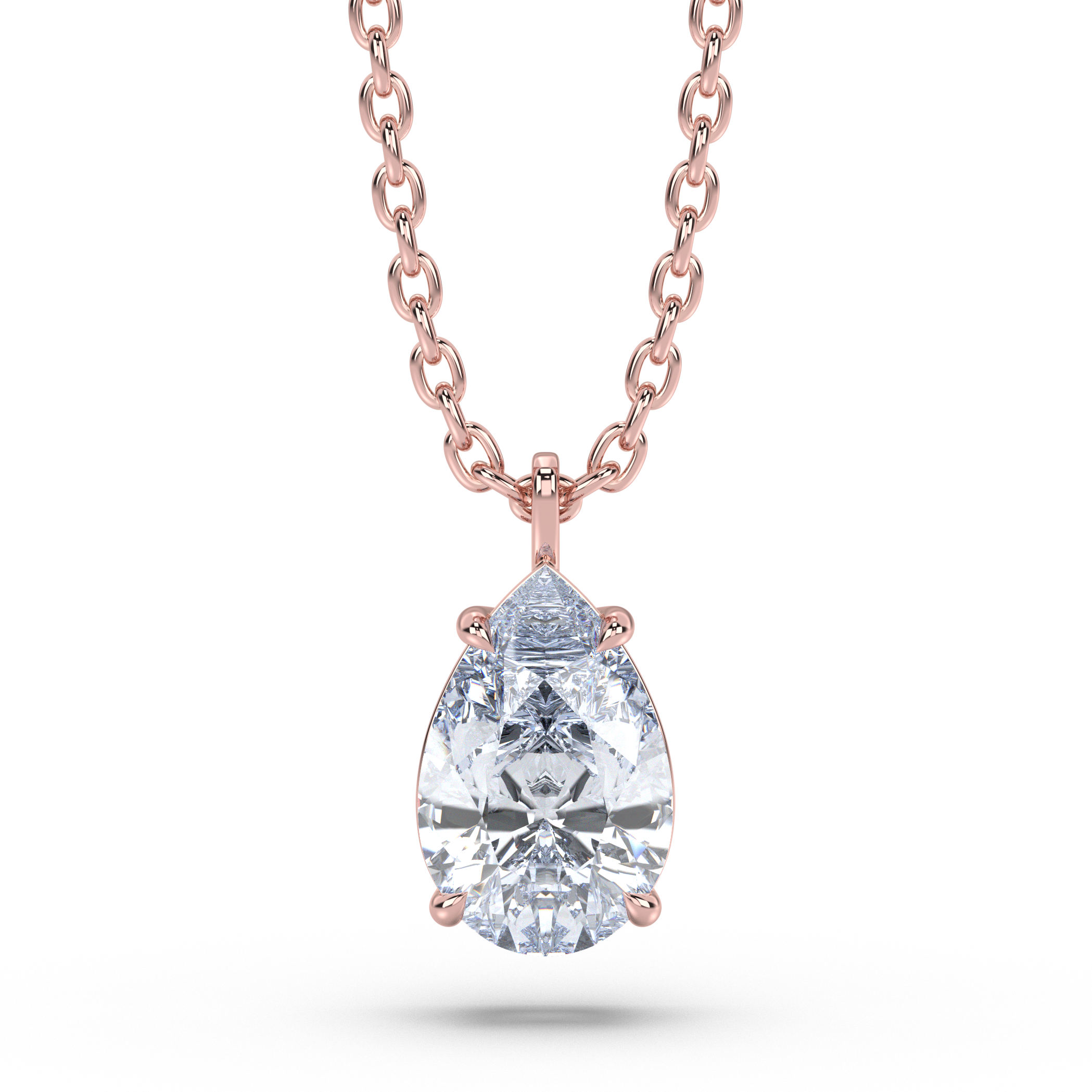 The centerpiece features an IGI-certified pear-cut lab grown diamond, ranging from 2.00 to 7.00 carats, in exceptional G+ color and VS1+ clarity. The pear cut's distinctive teardrop silhouette combines brilliant fire with elongated grace, creating a pendant that moves beautifully and catches light from every angle.