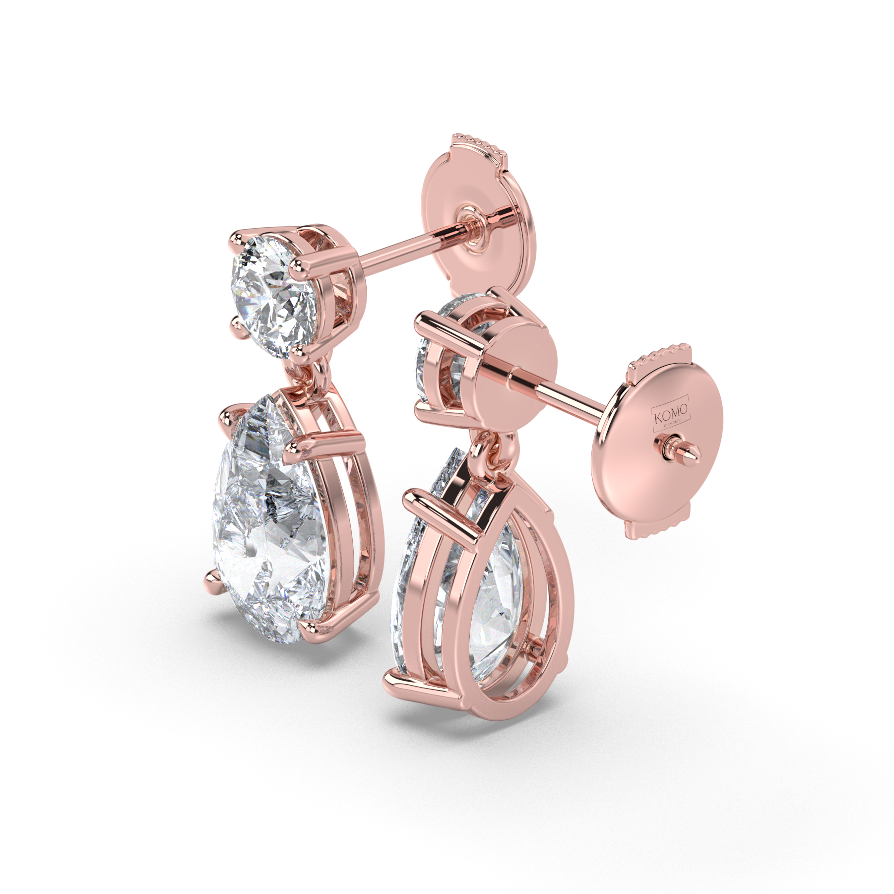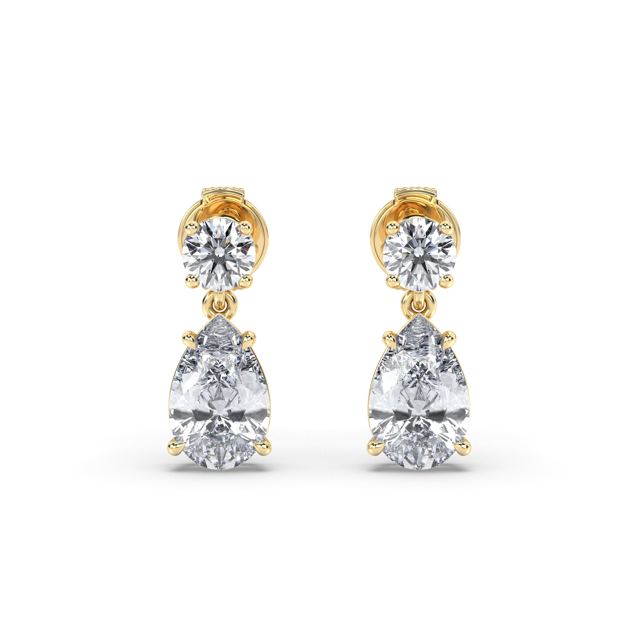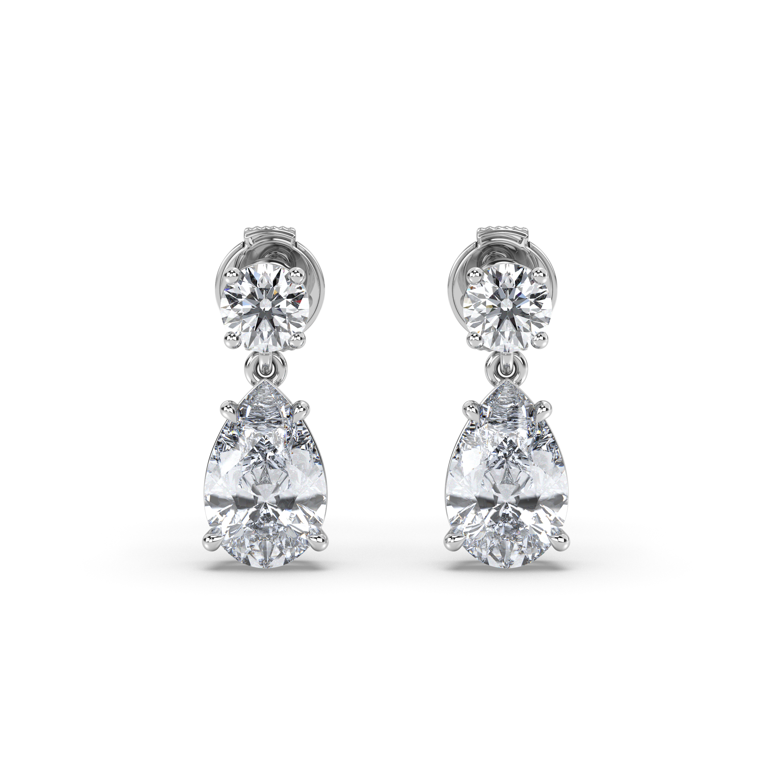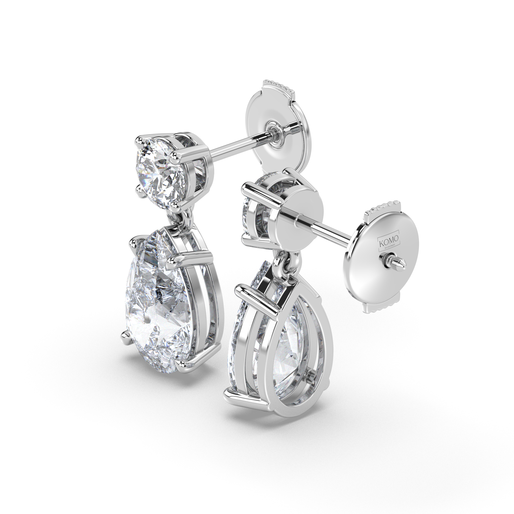 Each earring features IGI-certified lab grown diamonds from the total weight range of 2.00 to 6.00 carats for the pear-shaped centers, in exceptional G+ color and VS1+ clarity. The round brilliant tops showcase IGI-certified lab grown diamonds from the total weight of 1.00 carat for the pair, in premium E color and VS1 clarity, creating perfect balance between the components.