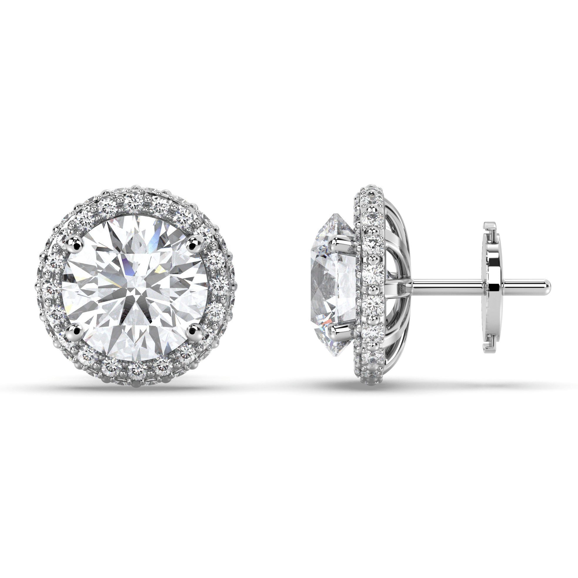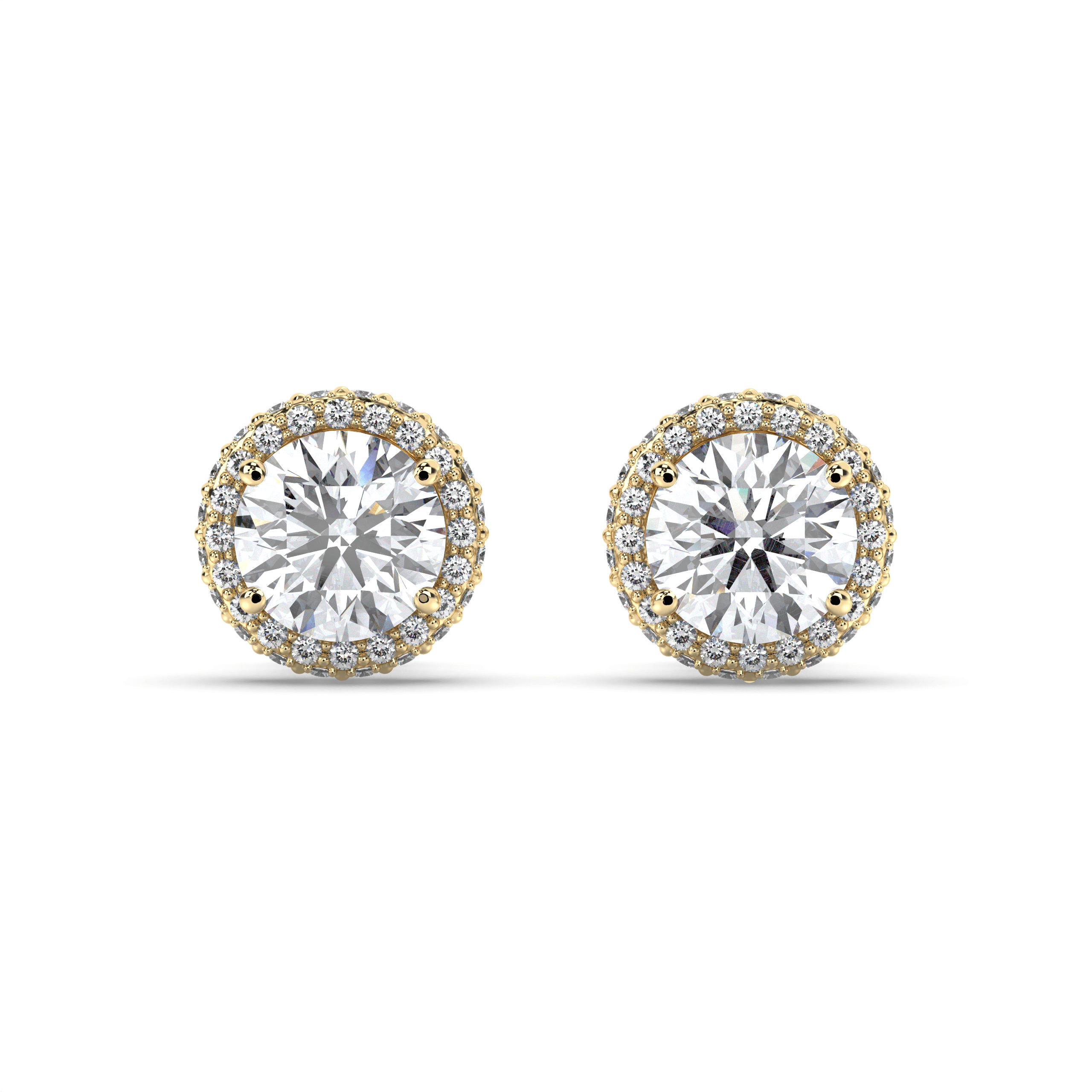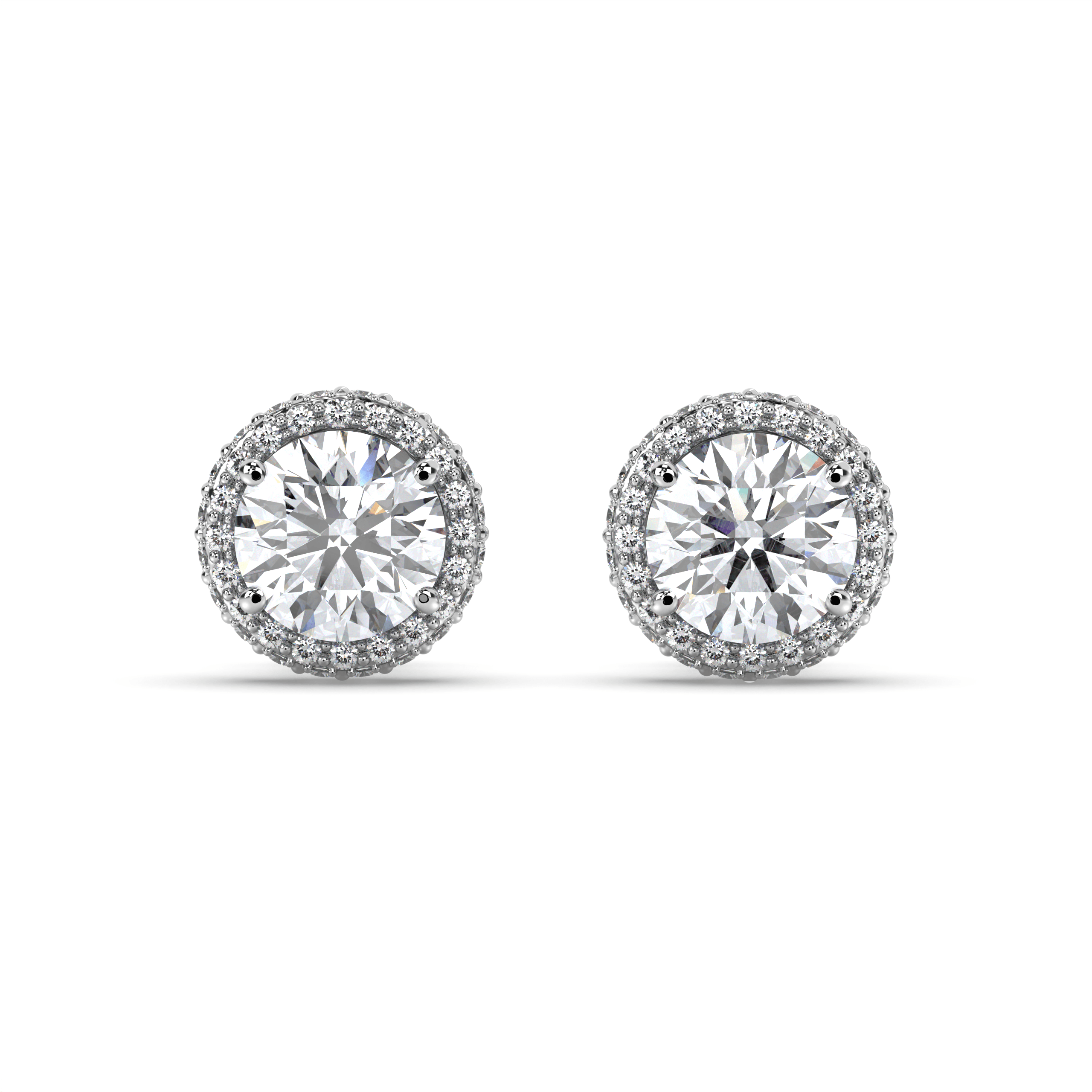 Each earring centers on an IGI-certified round brilliant lab grown diamond, ranging from 1.00 to 3.00 carats per stone, in exceptional G+ color and VS1+ clarity. The center stones are surrounded by perfectly aligned round lab grown diamonds that form crisp, geometric halos, creating the sharp symmetry that defines Deco Atelier design principles.