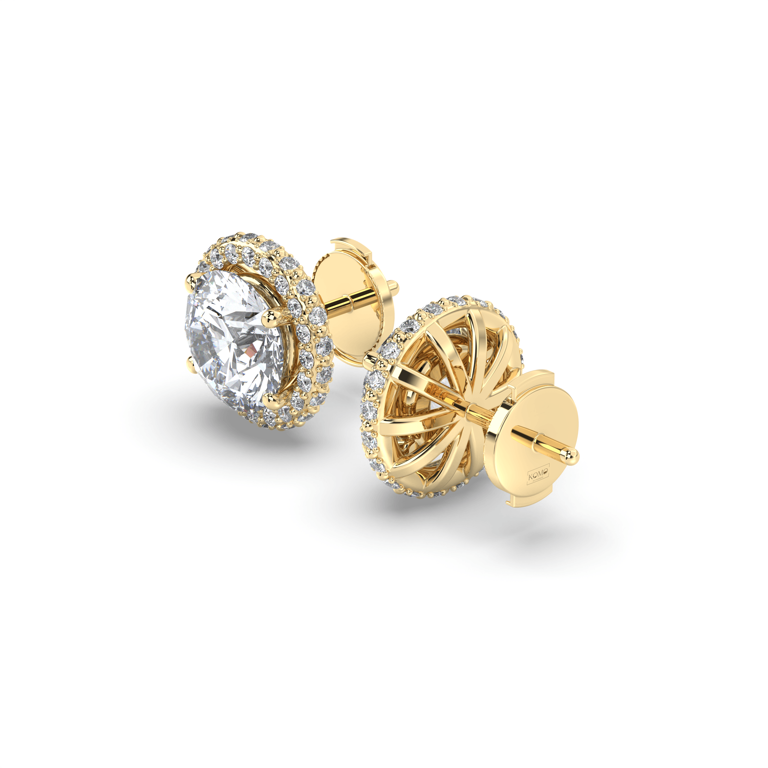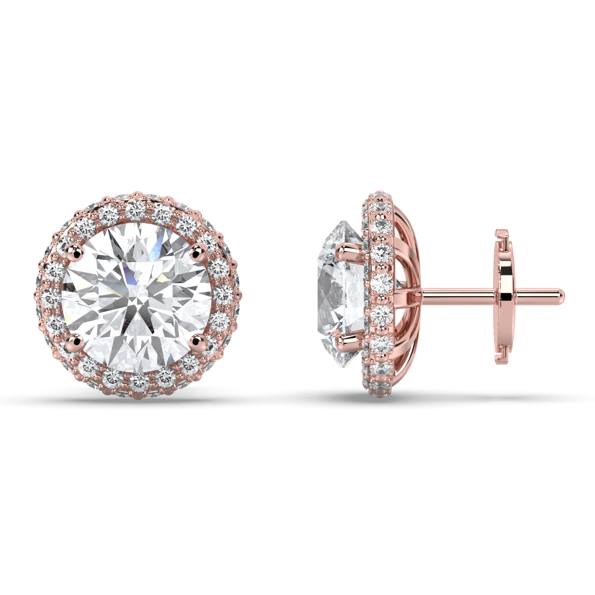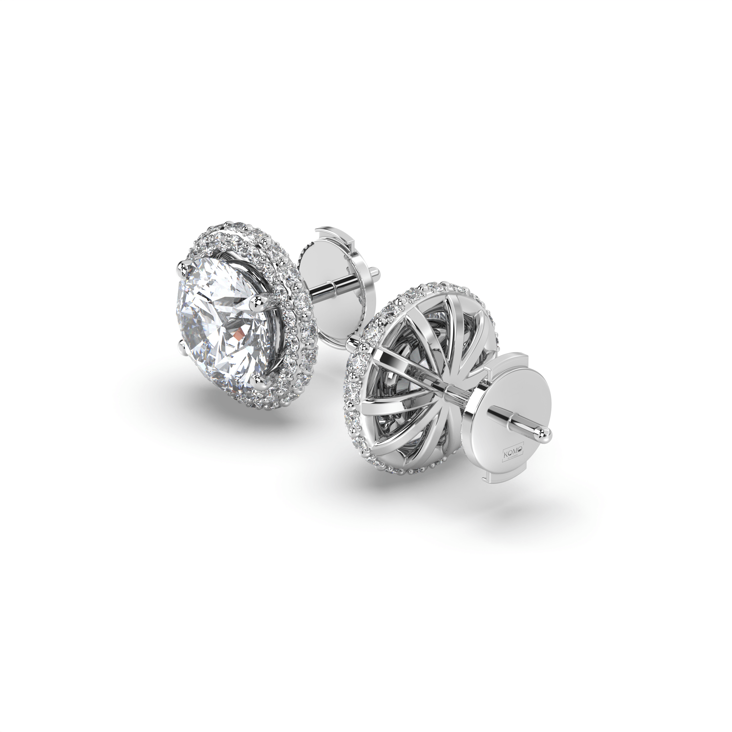 Each earring centers on an IGI-certified round brilliant lab grown diamond, ranging from 1.00 to 3.00 carats per stone, in exceptional G+ color and VS1+ clarity. The center stones are surrounded by perfectly aligned round lab grown diamonds that form crisp, geometric halos, creating the sharp symmetry that defines Deco Atelier design principles.