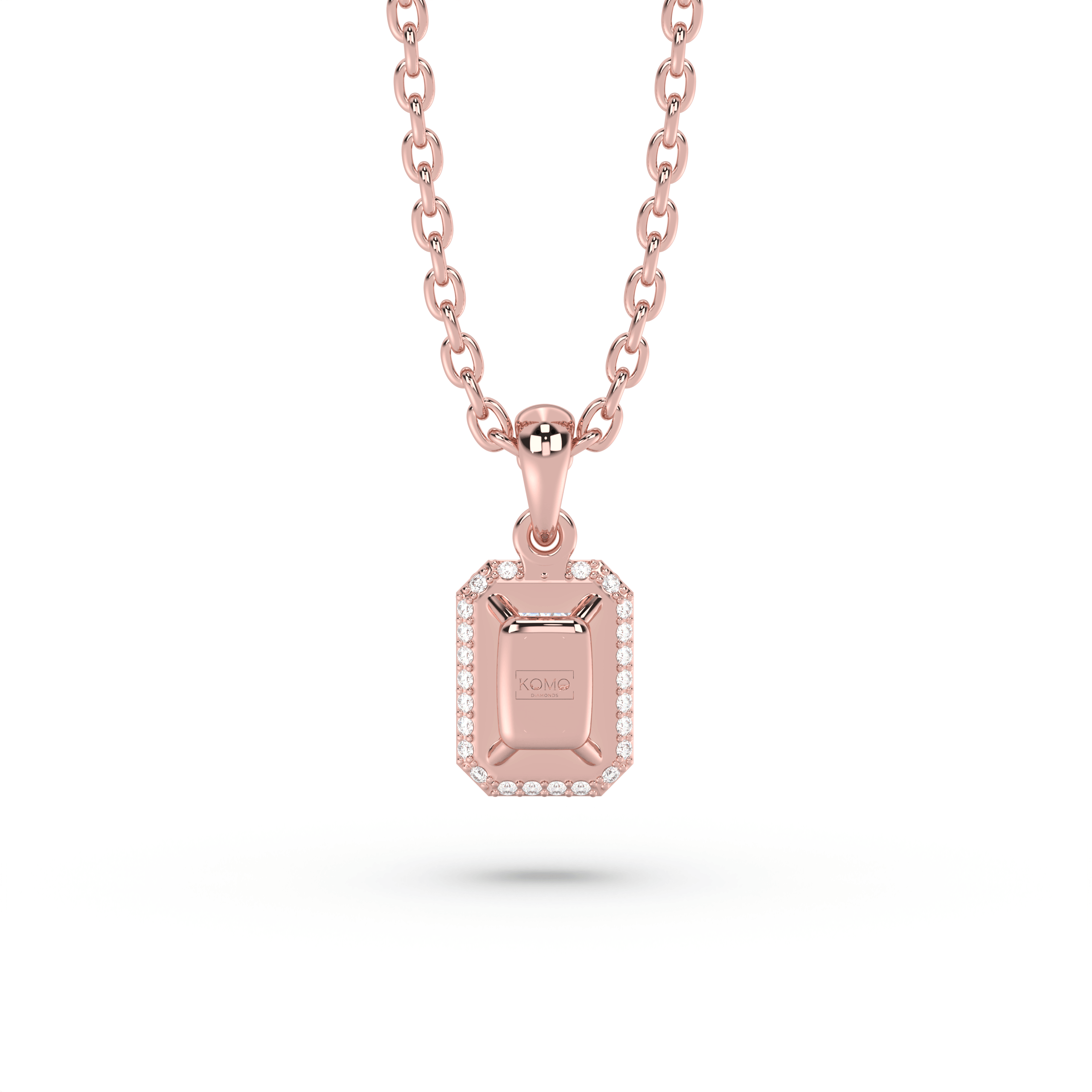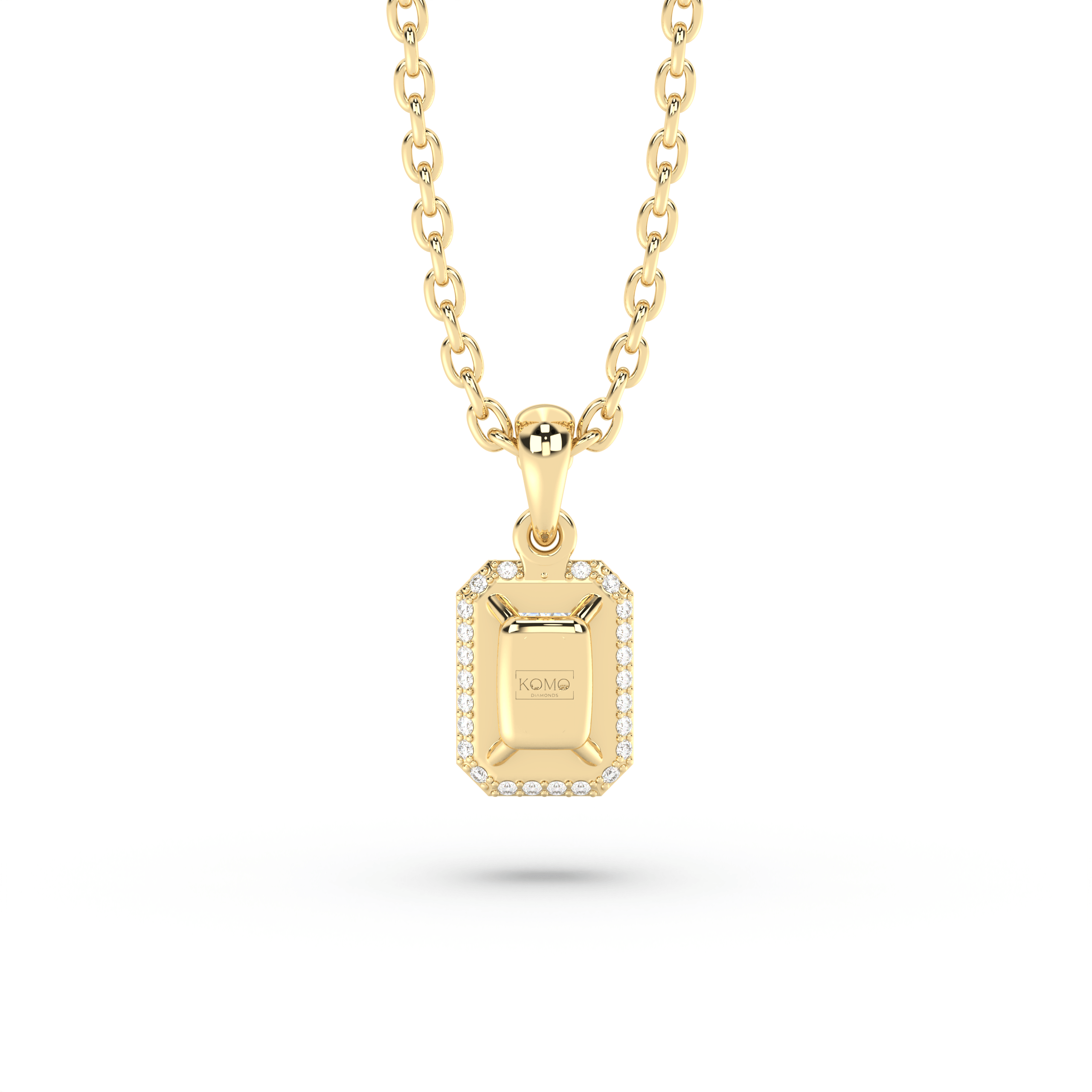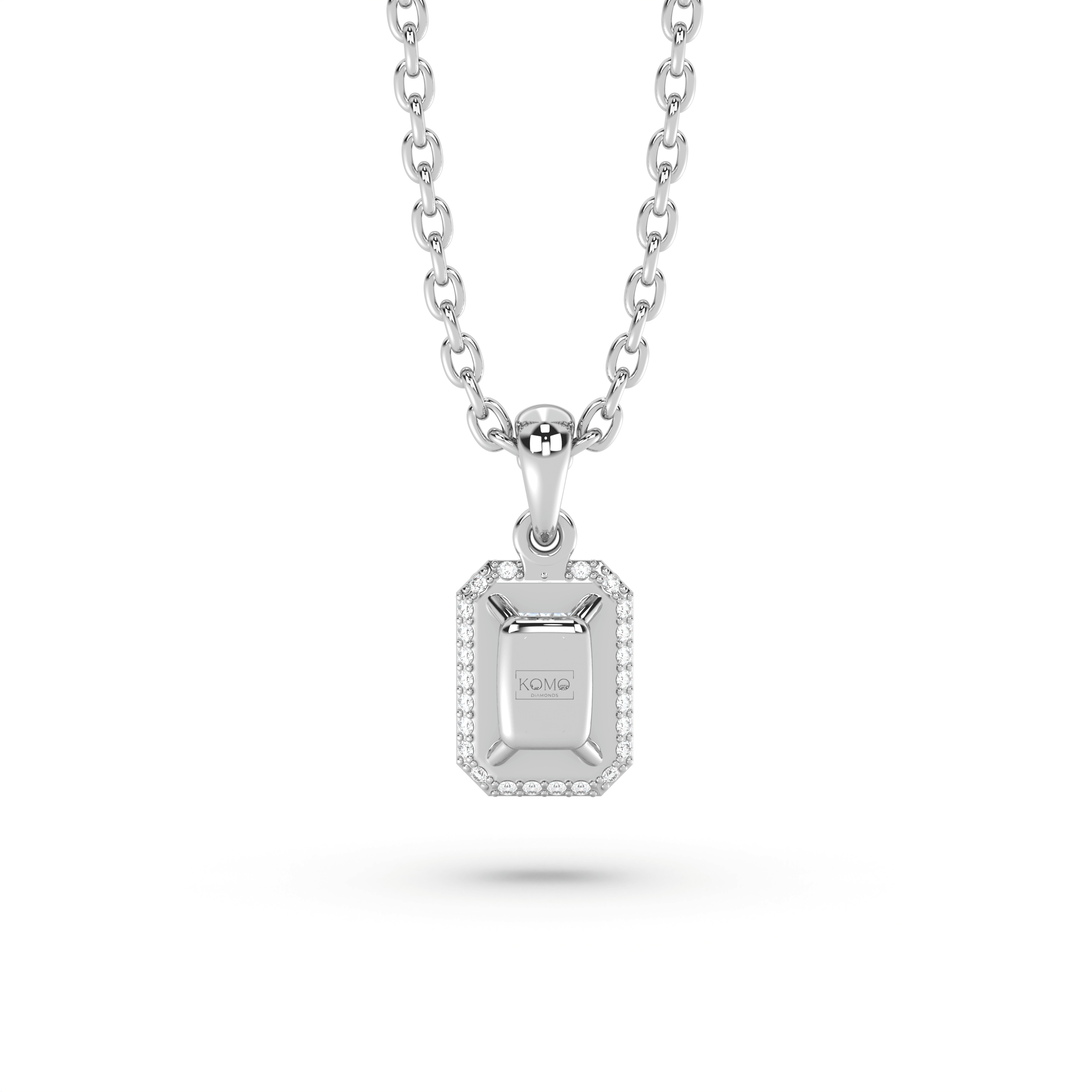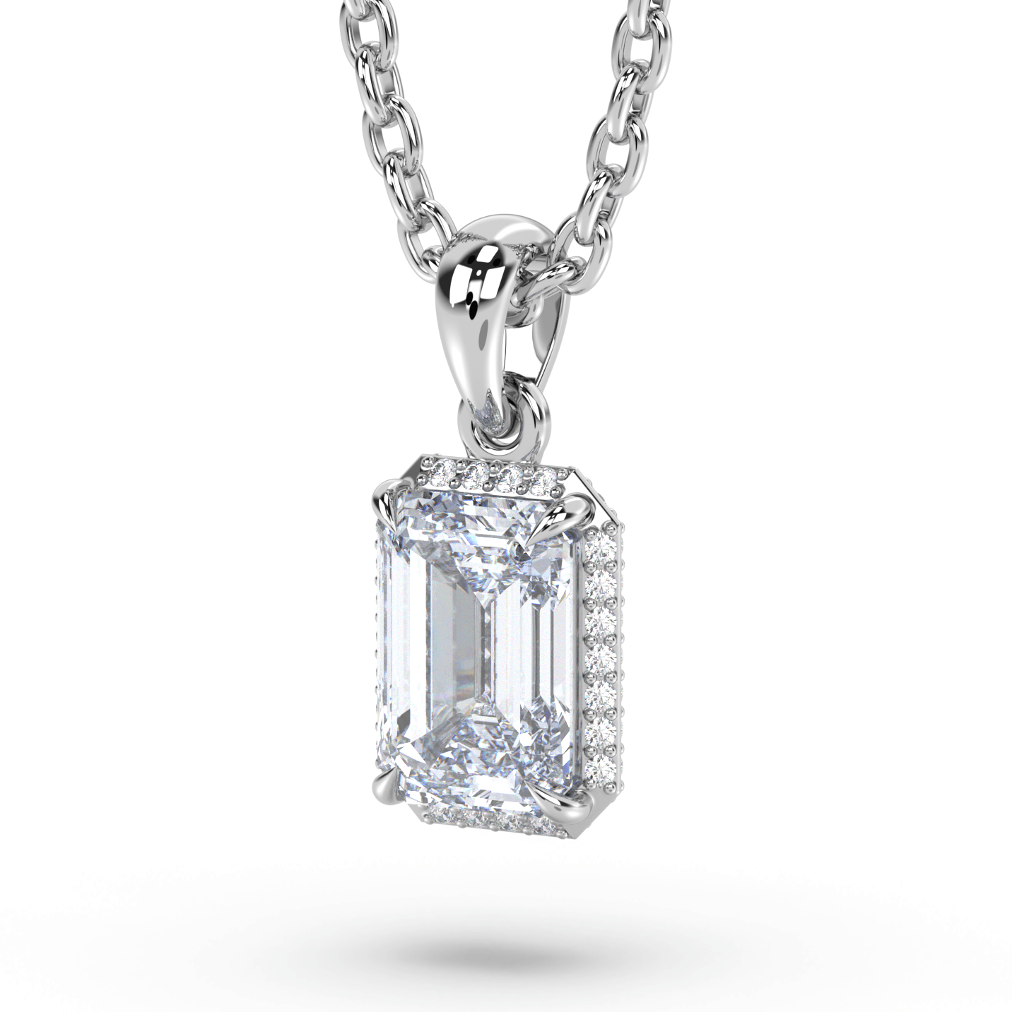 The Gatsby pendant captures the opulent spirit of Art Deco elegance through its perfect geometric composition. This architectural masterpiece from the Deco Atelier collection features a stunning emerald-cut lab grown diamond surrounded by a precise frame of brilliant-cut accent diamonds, creating a sophisticated interplay of light and symmetry.