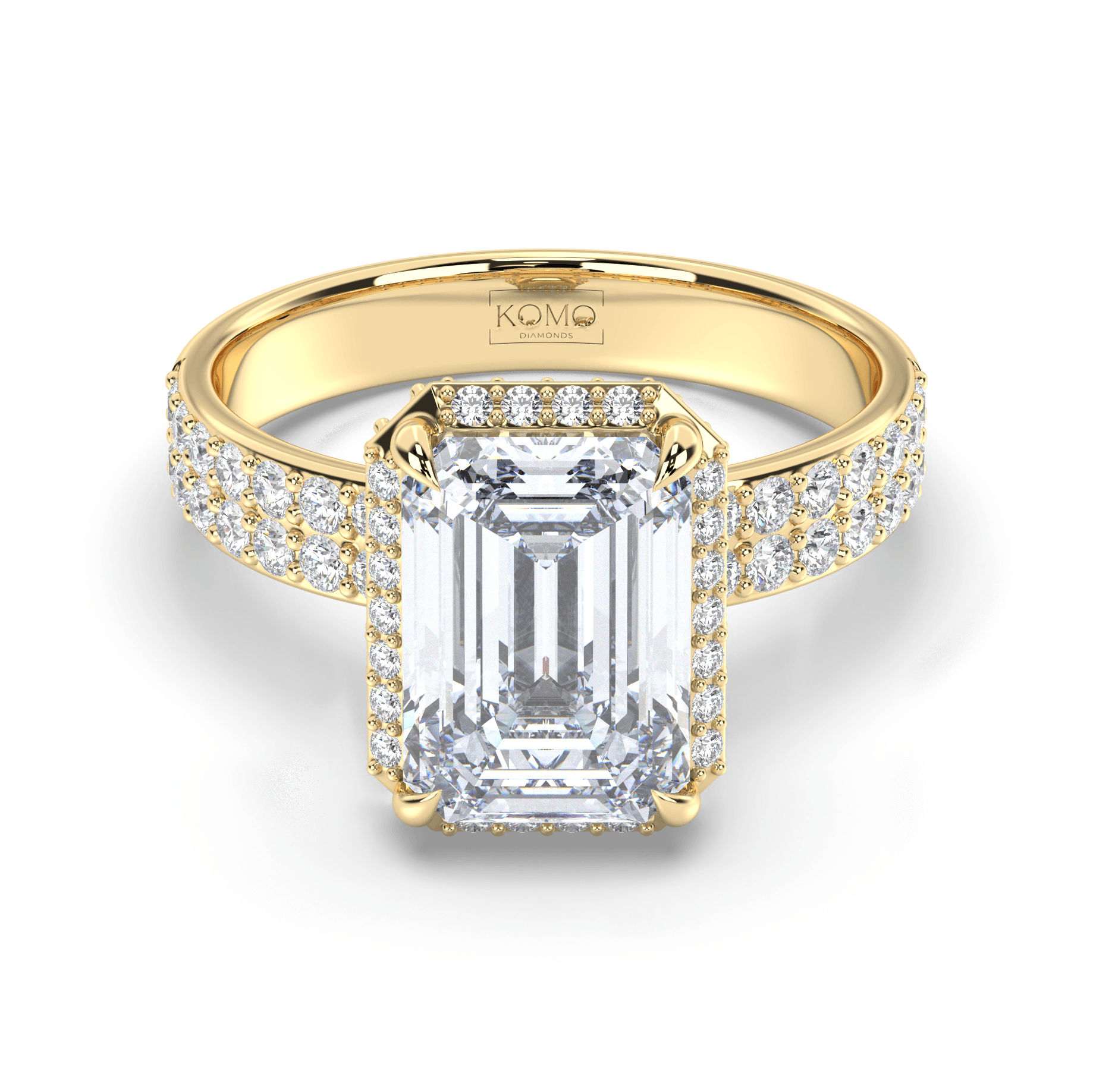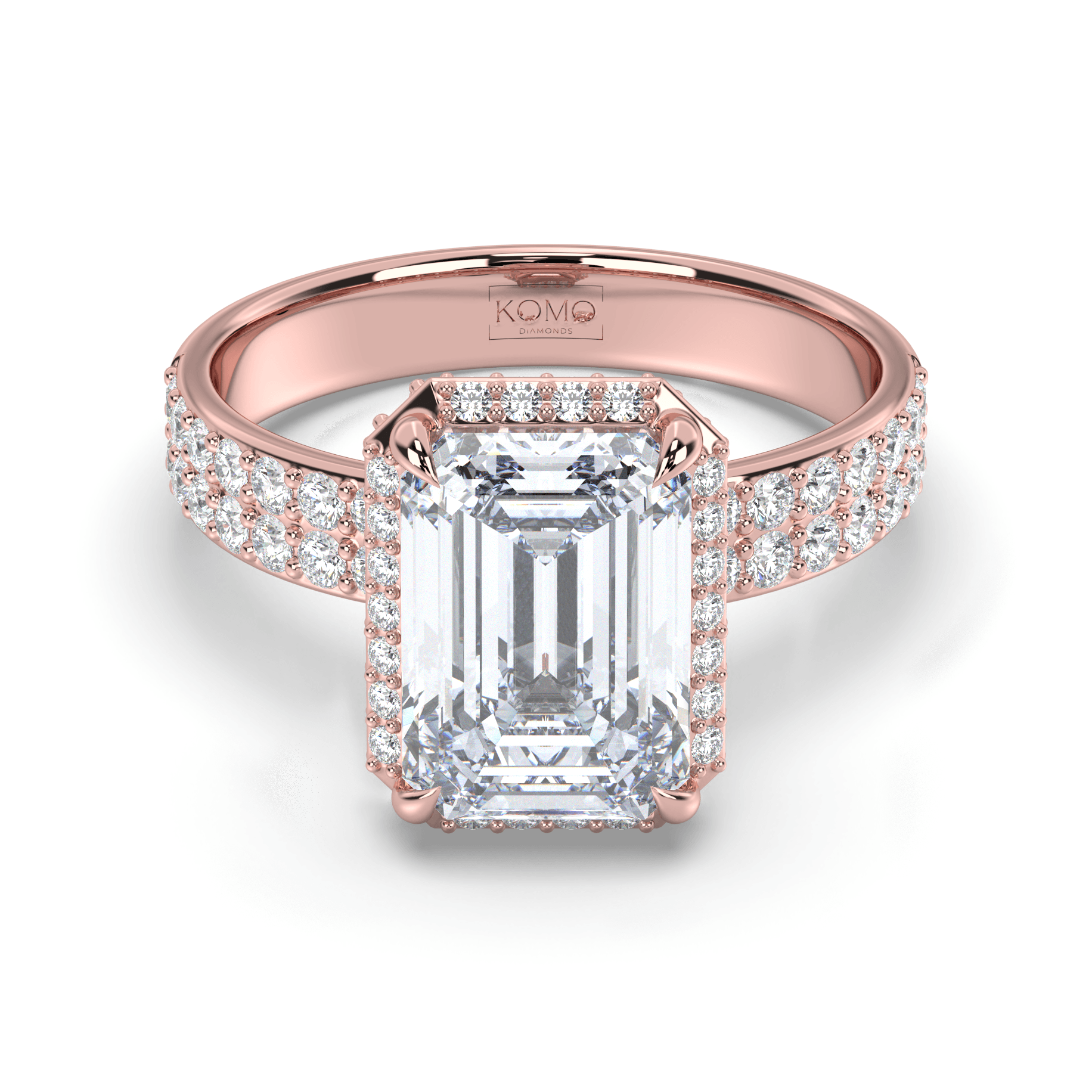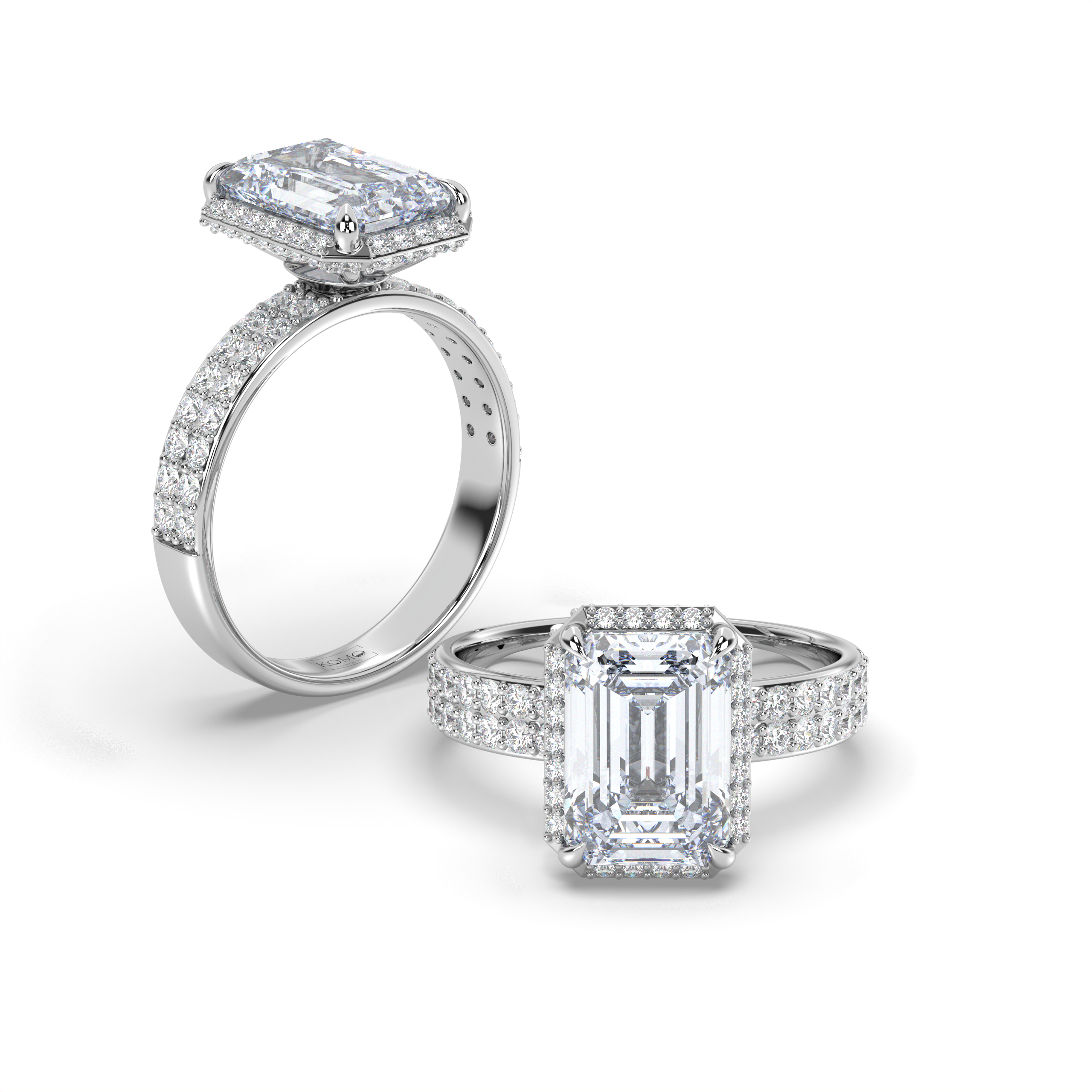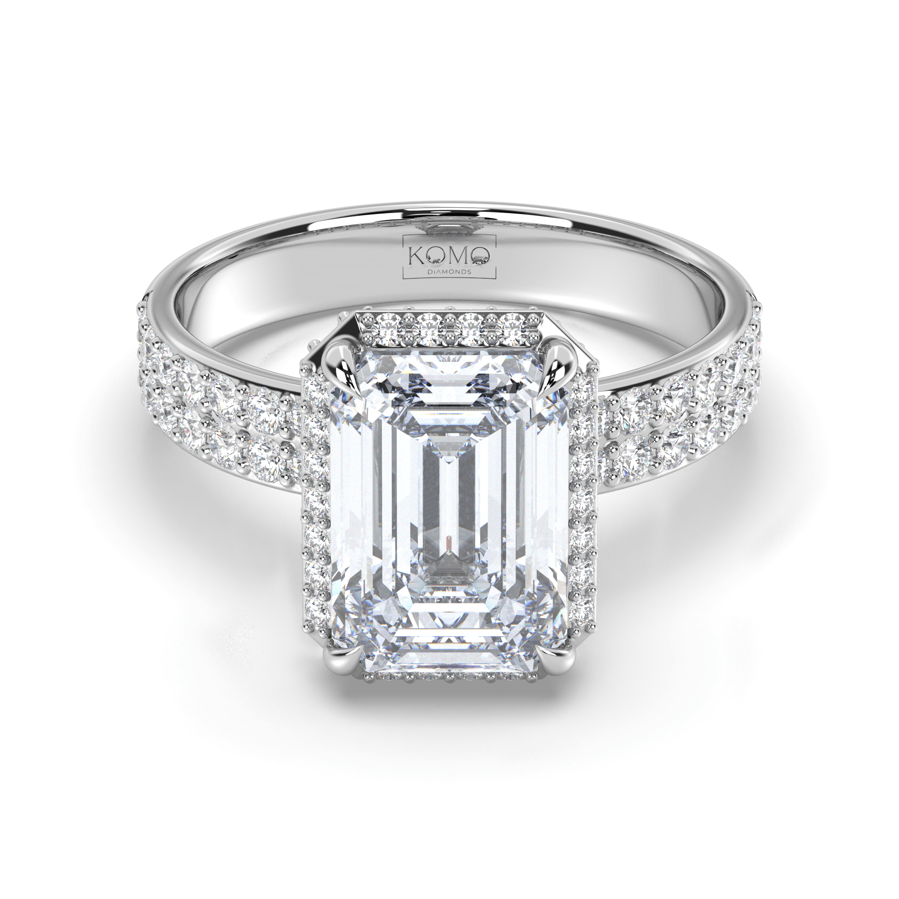 Each diamond is created using advanced CVD/HPHT technology, possessing identical properties to mined diamonds while representing sustainable luxury. The emerald-cut's distinctive step-cut faceting creates hall-of-mirrors brilliance, while the micro-pavé halo and double-row shank amplify the center stone's architectural beauty with continuous sparkle.