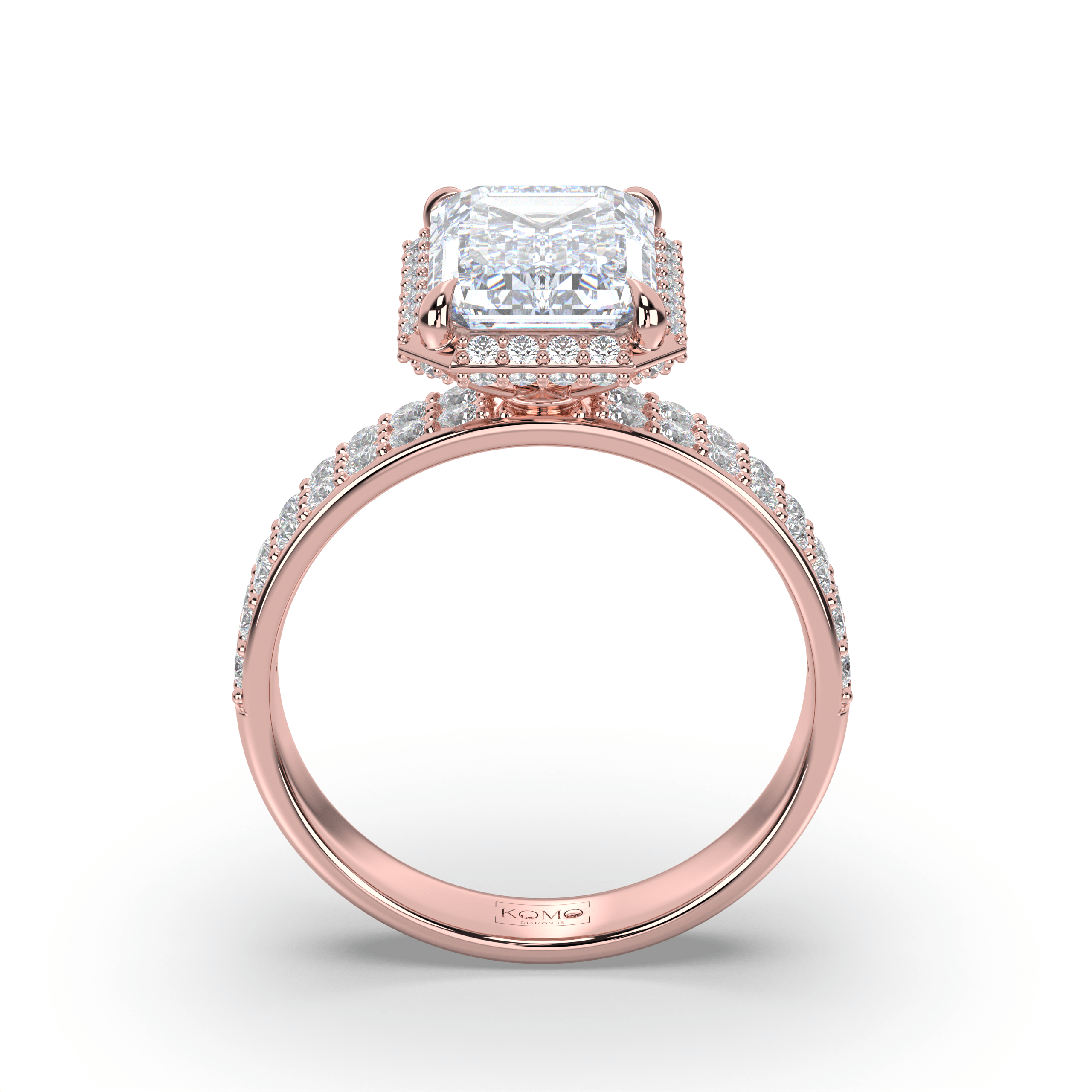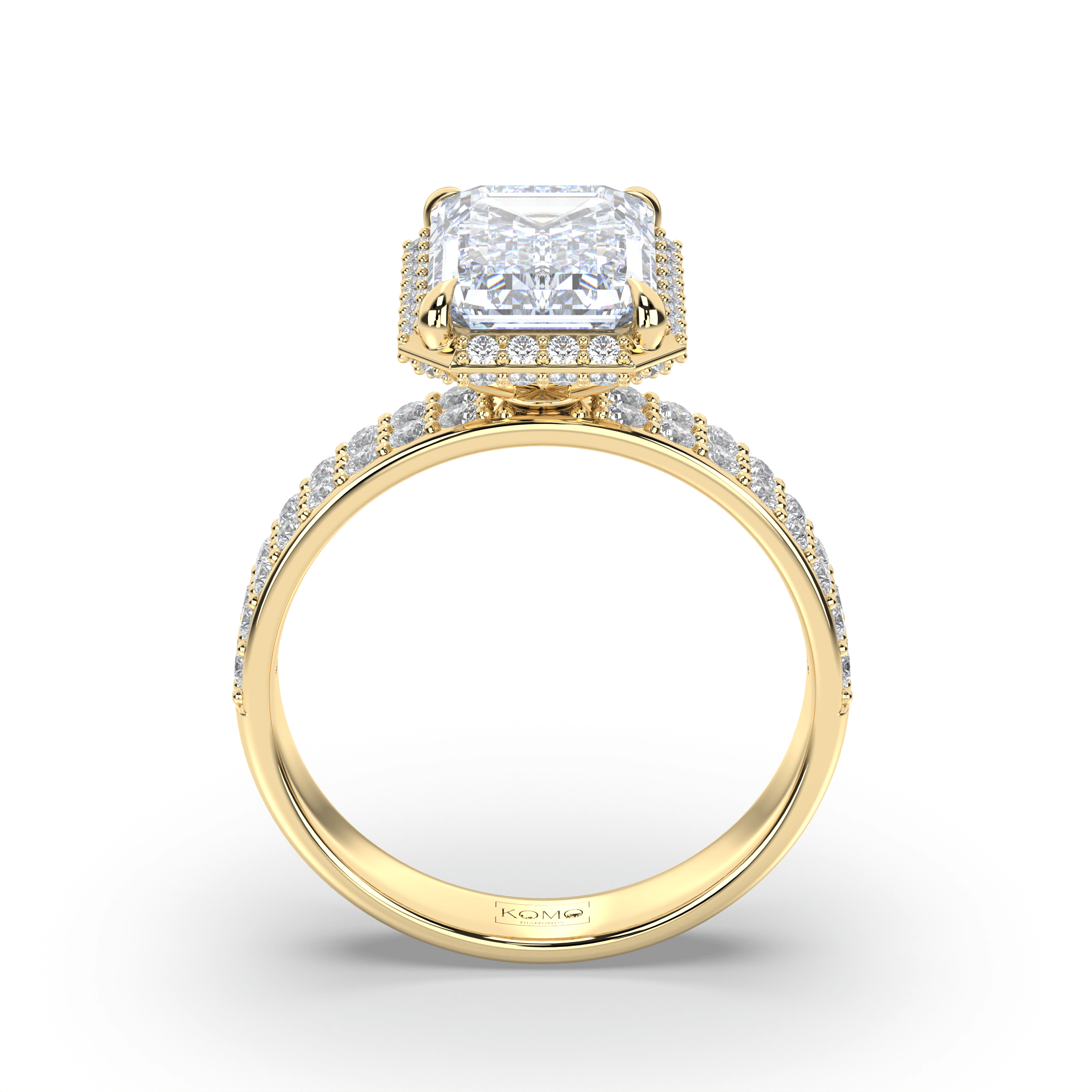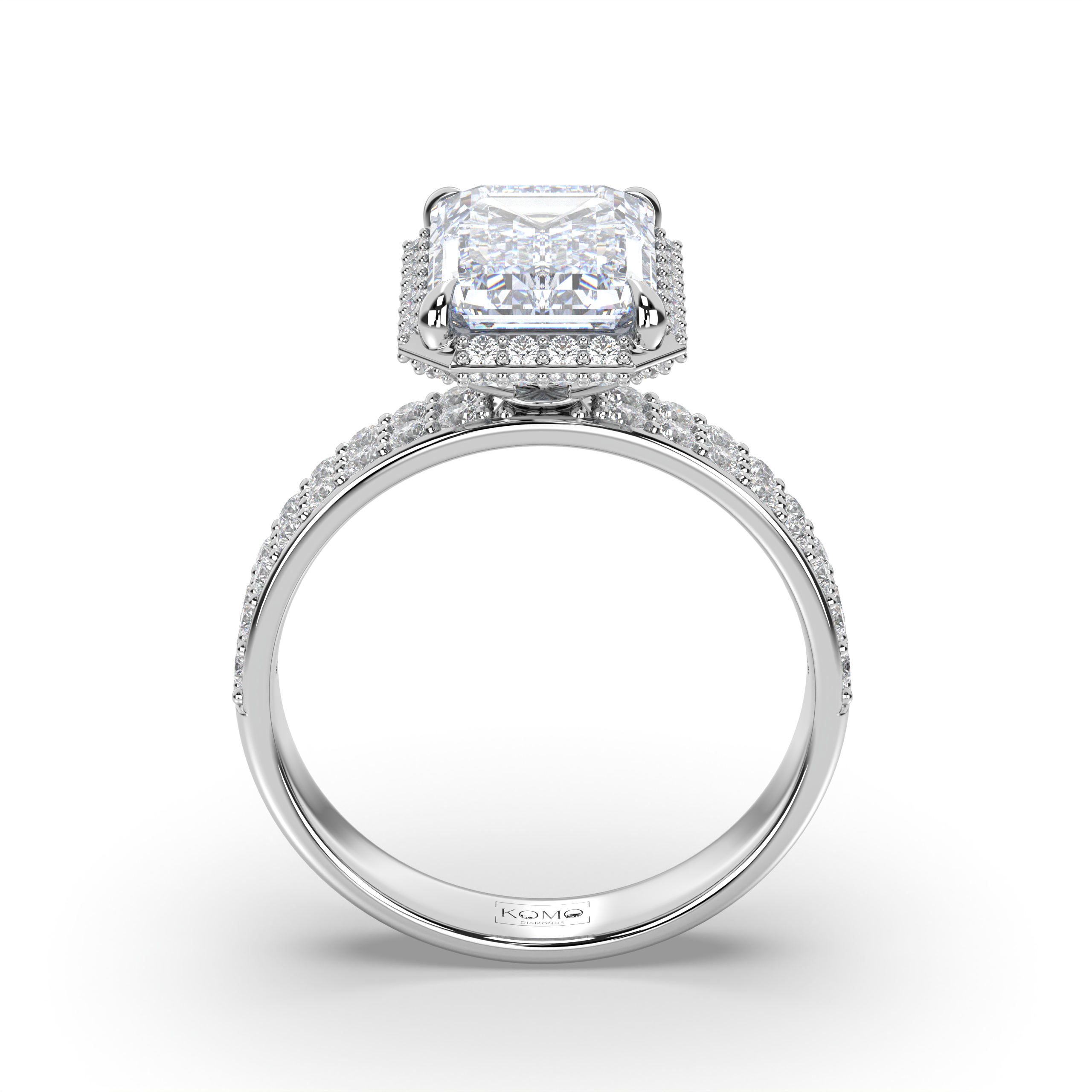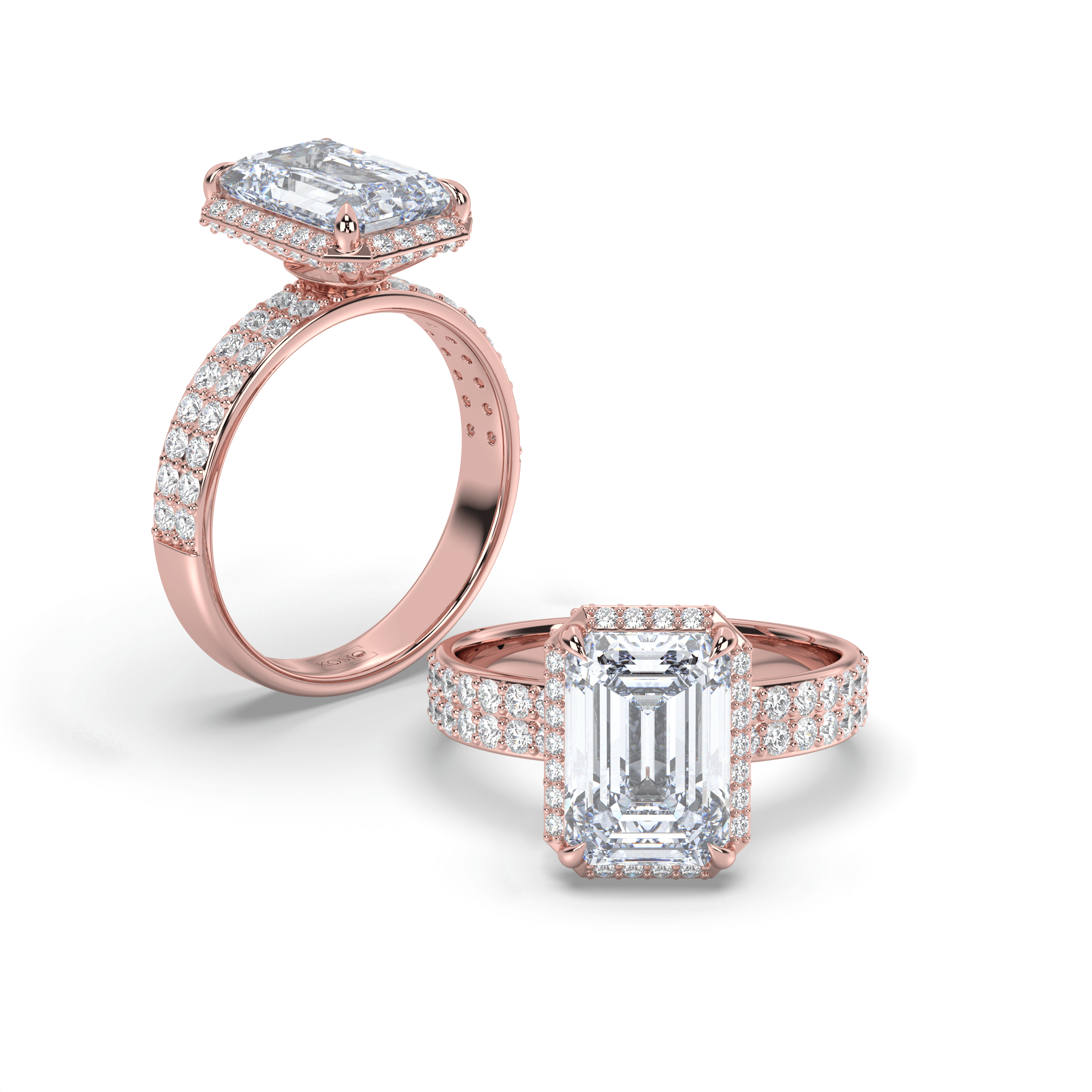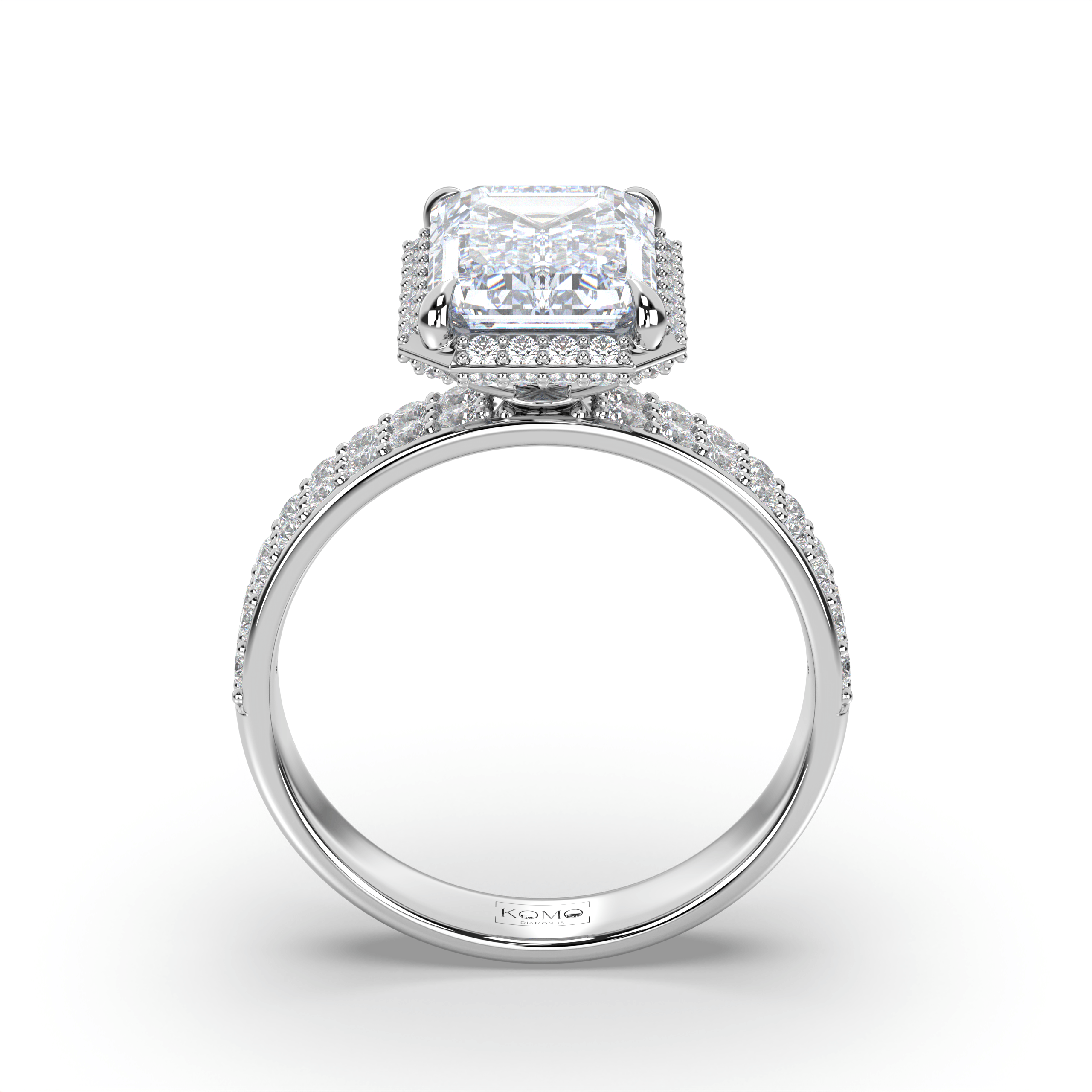 Each diamond is created using advanced CVD/HPHT technology, possessing identical properties to mined diamonds while representing sustainable luxury. The emerald-cut's distinctive step-cut faceting creates hall-of-mirrors brilliance, while the micro-pavé halo and double-row shank amplify the center stone's architectural beauty with continuous sparkle.