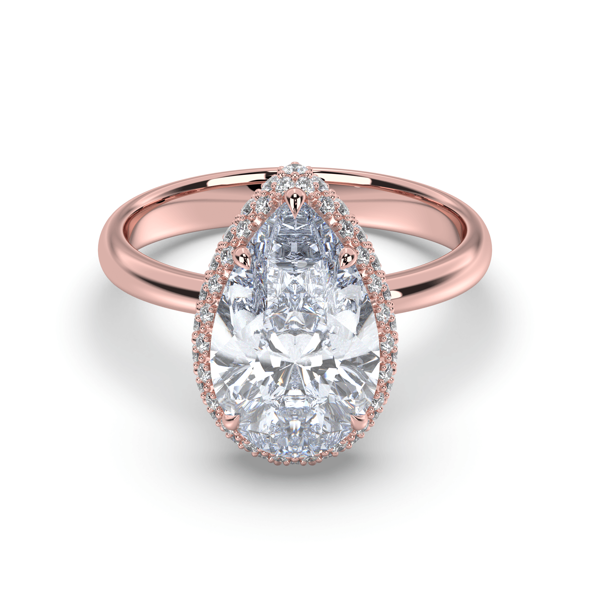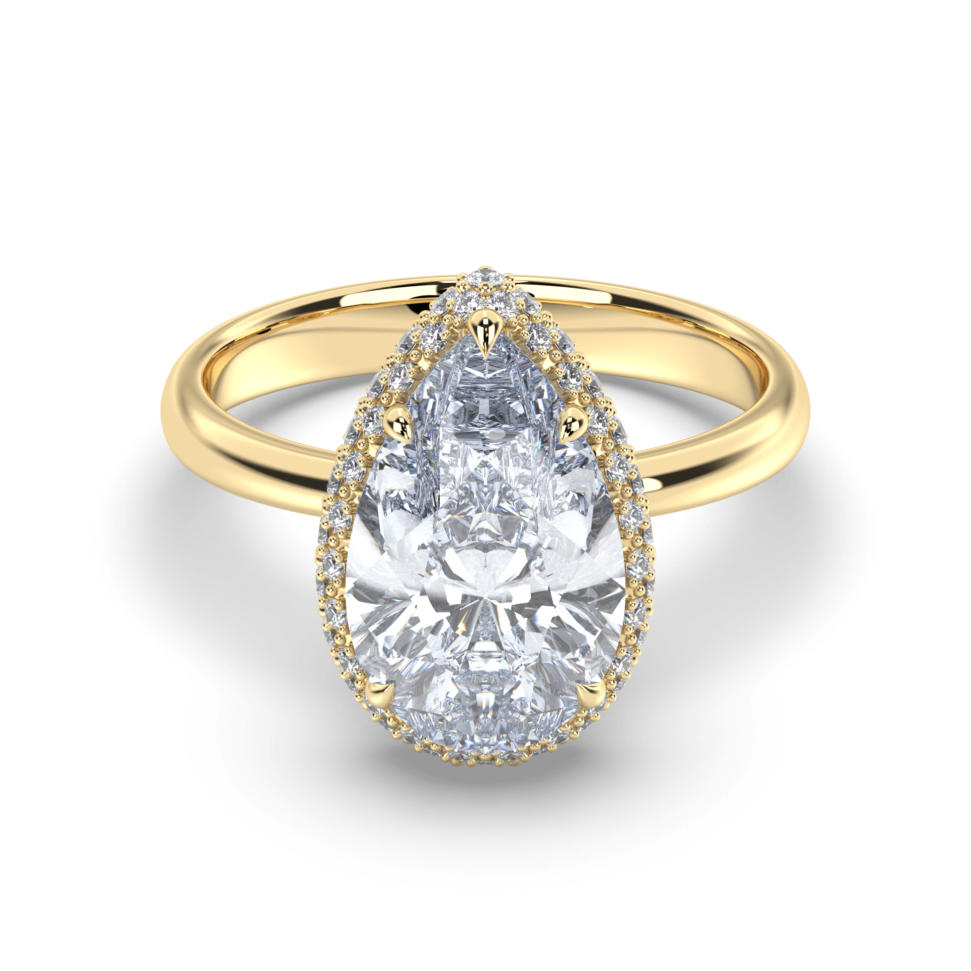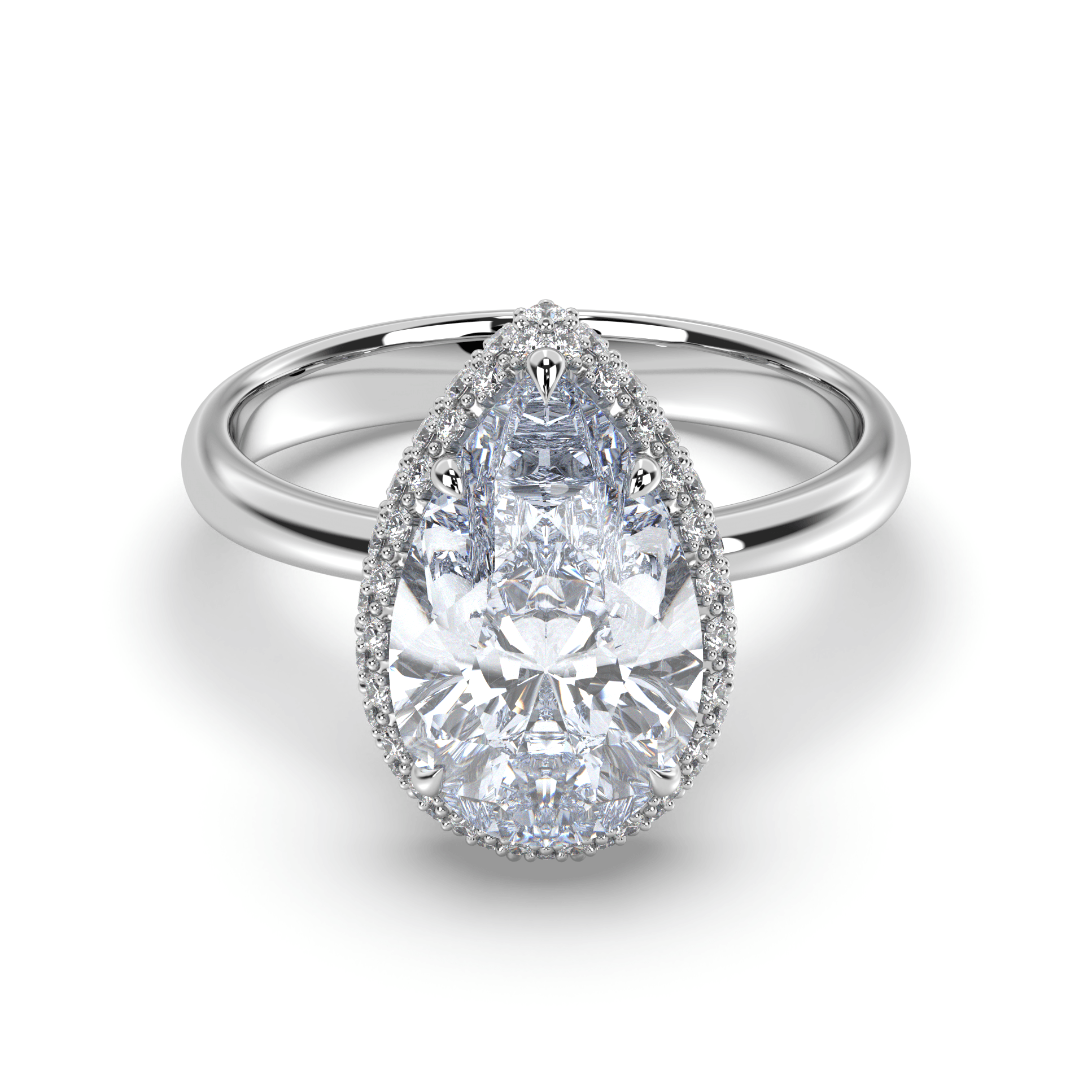 Experience lyrical romance where pear-cut brilliance meets halo enhancement in a graceful symbol of sustainable love and timeless feminine beauty.