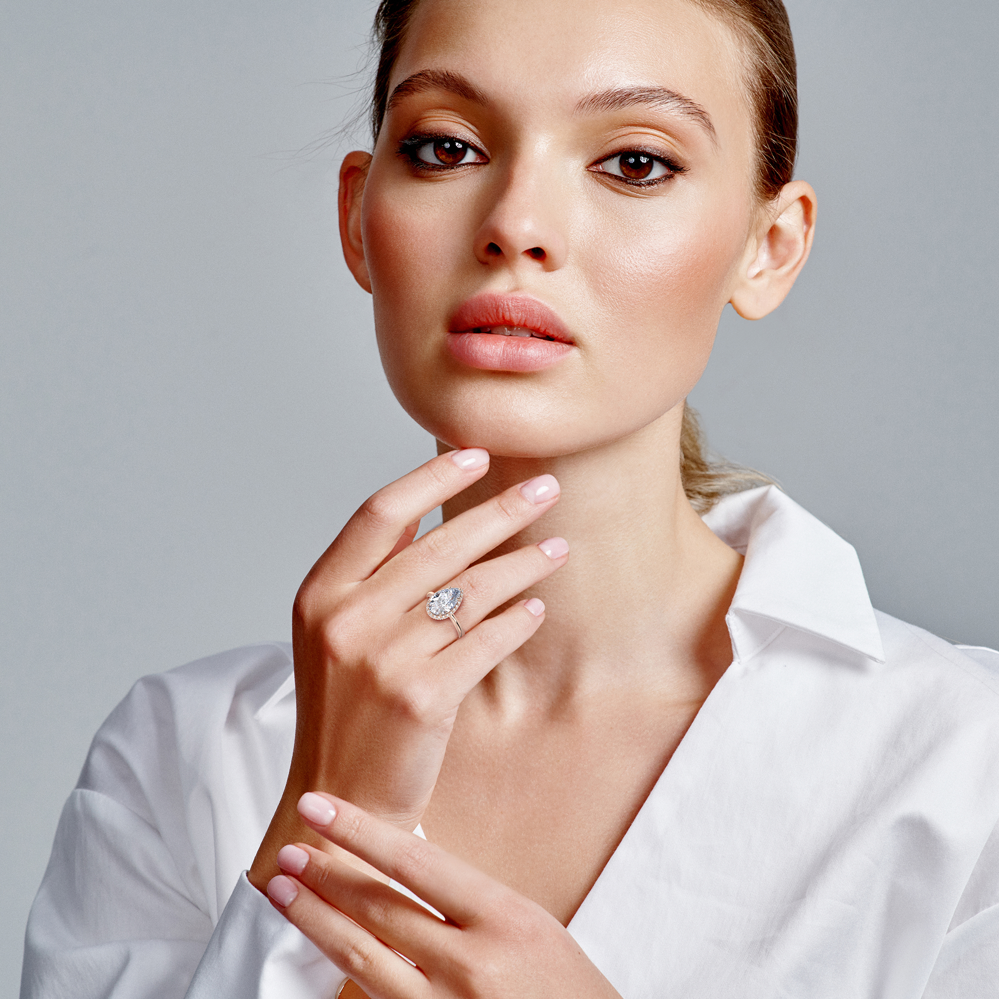 The micro-pavé halo contains 0.46-0.66 carats of premium round lab-grown diamonds with pristine E color and VS1 clarity, creating a luminous frame that enhances the pear's natural beauty. The plain shank allows the halo design to take center stage while ensuring comfortable daily wear that embodies the Muse collection's wearable poetry.