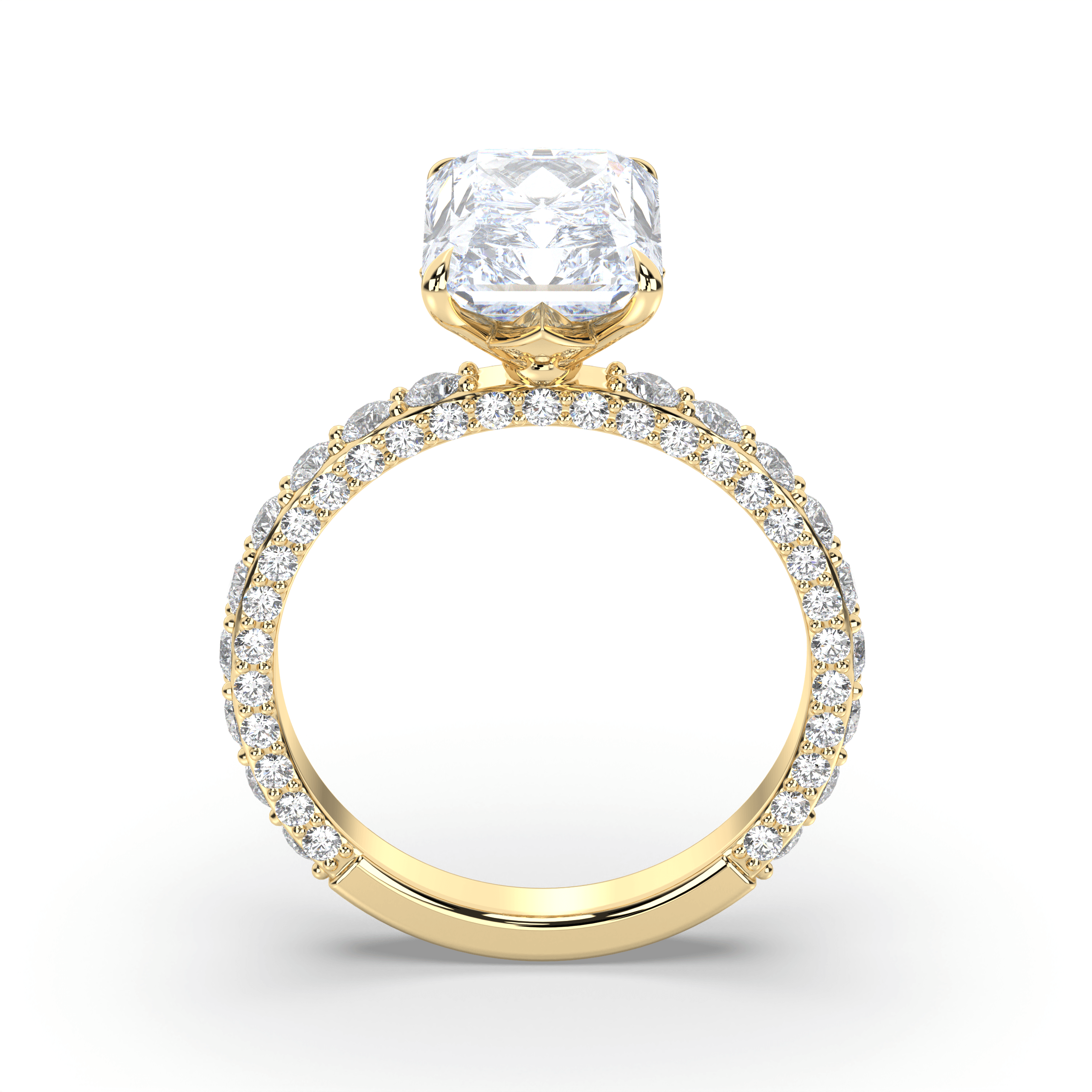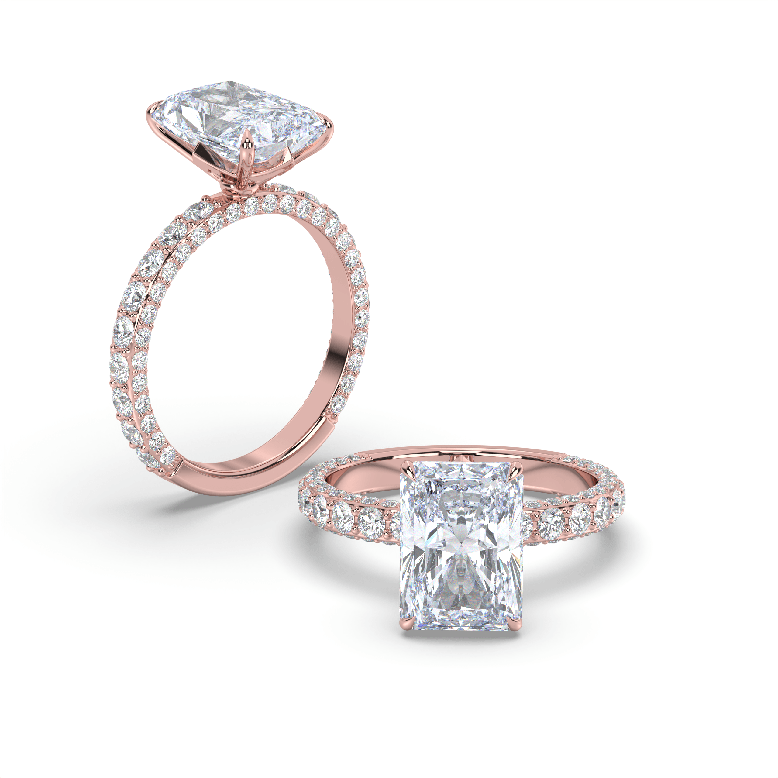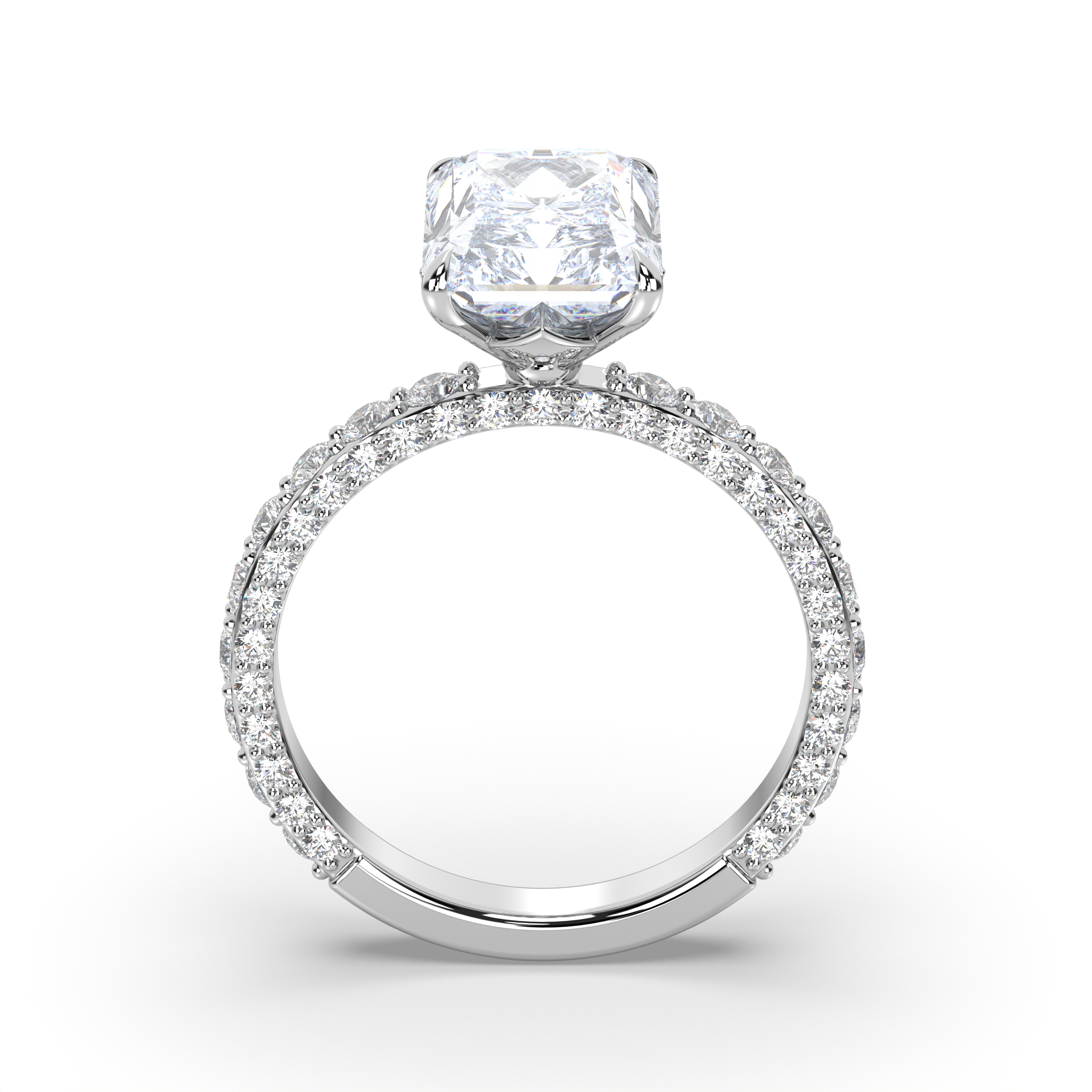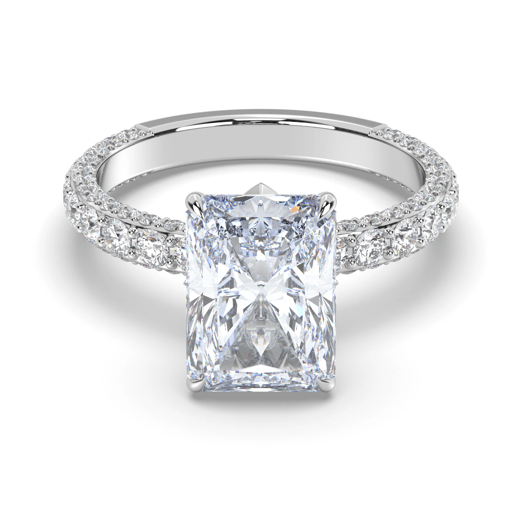 The pavé shank contains 1.12 carats of premium round lab-grown diamonds with pristine E color and VS1 clarity, creating continuous sparkle that enhances the radiant-cut's architectural beauty. This sophisticated combination delivers the collection's edge-to-edge clarity while ensuring substantial presence and comfortable wear.
